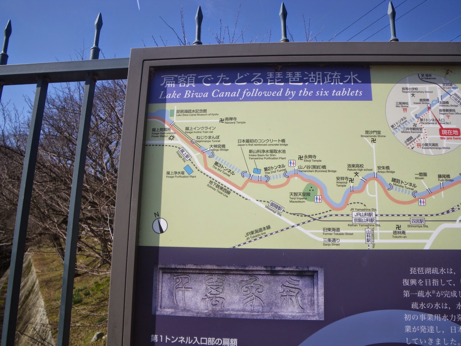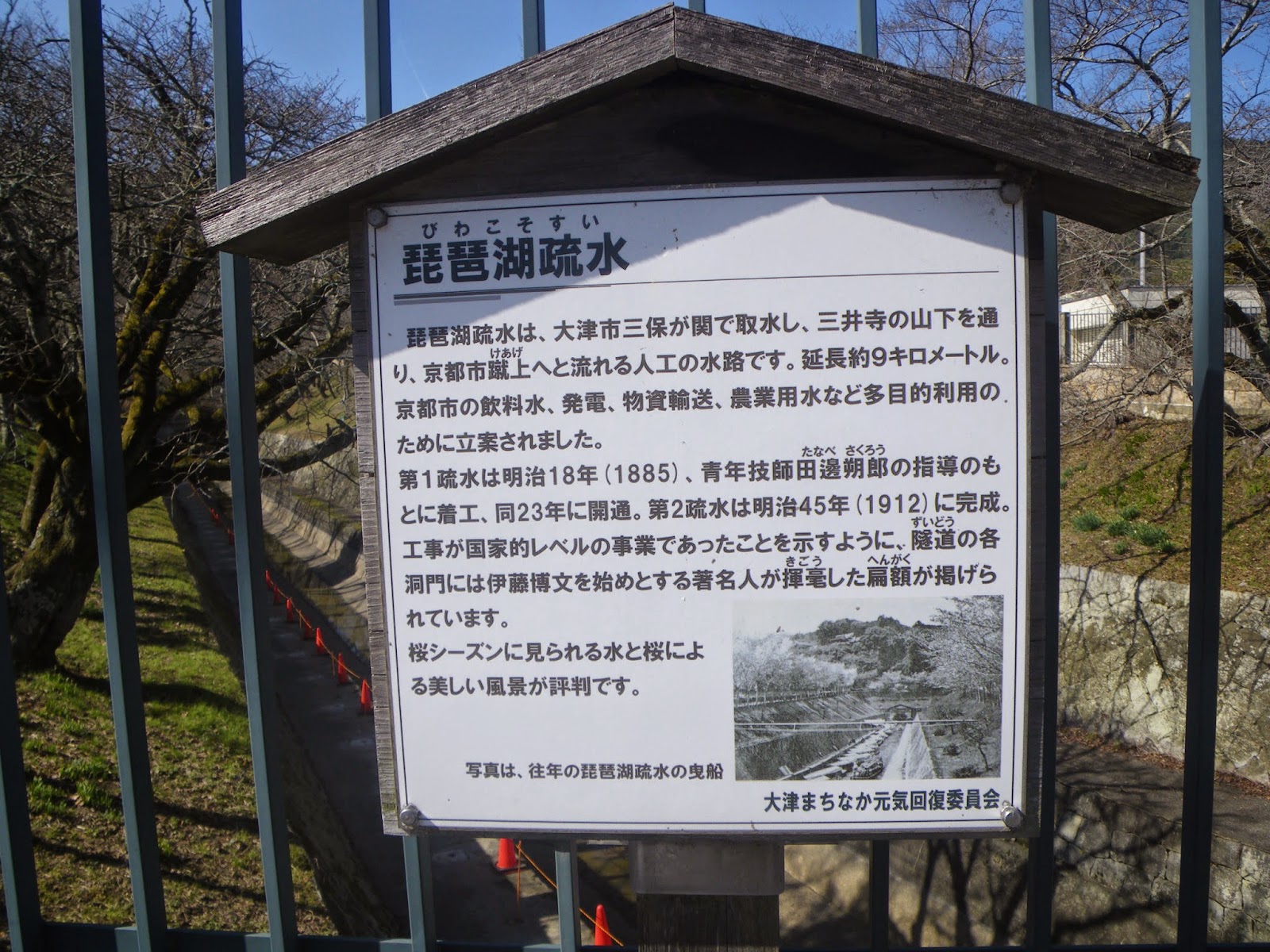 第1疏水は明治18年(1885)、青年技師田邊朔郎の指導のもとに着工、同23年に開通。第2疏水は明治45年(1912)に完成。工事が国家的レベルの事業であったことを示すように、隧道の各洞門には伊藤博文を始めとする著名人が揮毫した扁額が掲げられています」とある。