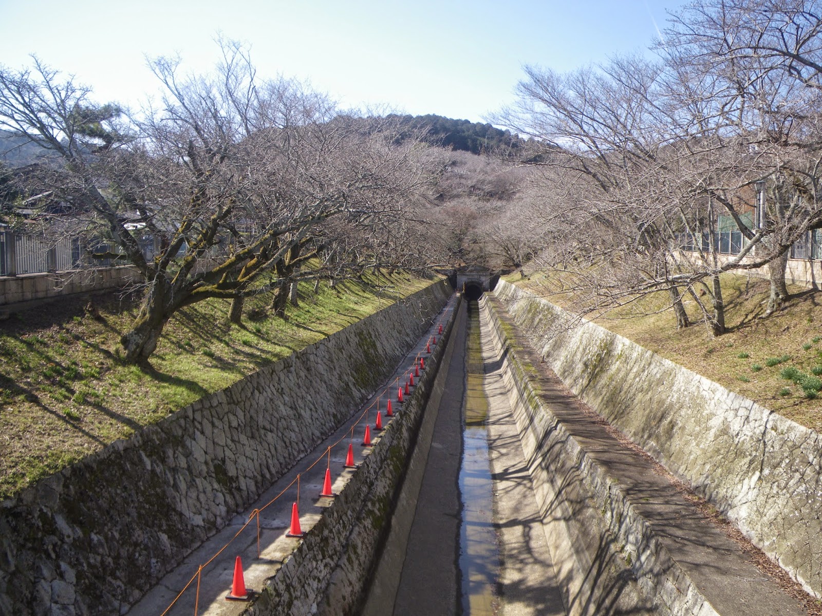 それはそれとして、疏水の延長は約9キロとのこと。12キロと書いた記事もあり、京都市水道局の資料をチェックすると、取水口から蹴上上までが8,180m,蹴上下の南禅寺船溜までは8,762mであった。それでは取水口と蹴上の上部までの高低差はどのくらいかチェックする。4mとか3.4mとかいろんな記述がありはっきりしないが、ともあれ、3キロを1m下がるといった緩やかな勾配で進むようだ。実際水路を見ても、ほとんど水平に見えるほどである。
