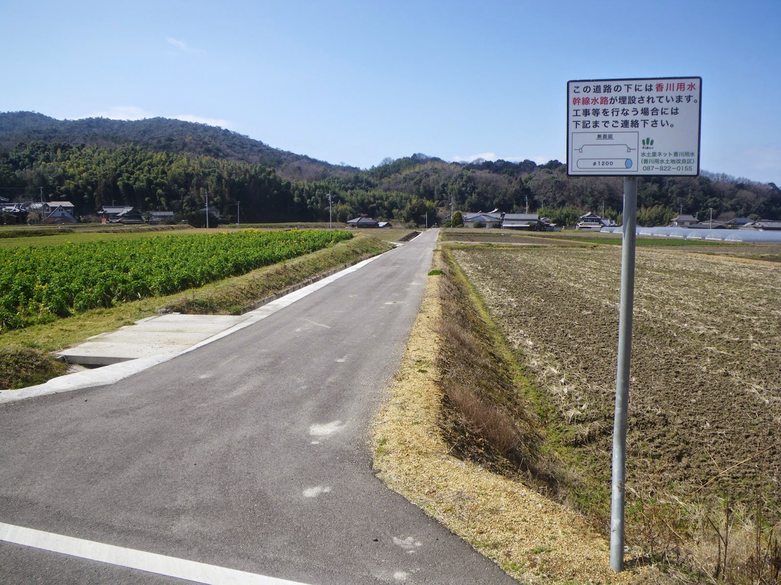 川を迂回し、二車線の車道の一筋北の農道を西に進むと、水路ラインがその農道とクロスする箇所に「香川用水」の案内があった。案内といっても、水路管埋設の注意案内。「香川用水幹線水路が道路下に埋設されているため、工事の際には注意すること」、とあった。少なくとも香川用水水路のオンコースであることは確認できた。
