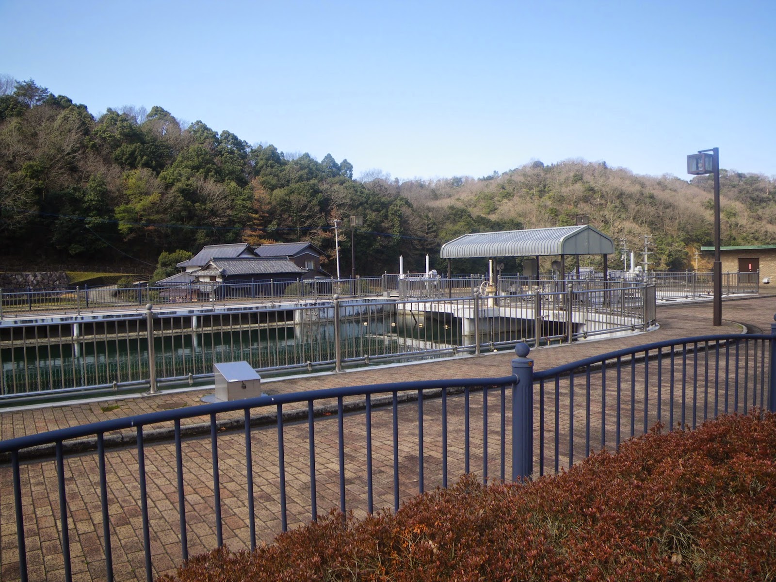 水路施設を見終え、道に戻るべく築堤を南端に戻ると、先ほど上った道の先にちょっとした広場があり、そこに香川用水の案内があった。
