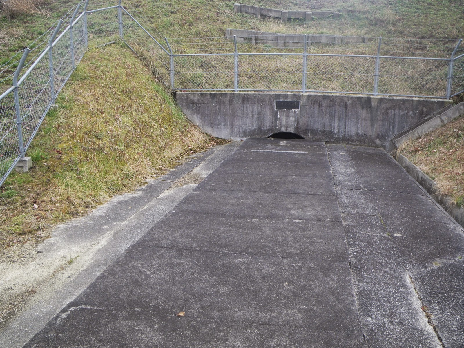 人道橋を渡り、南北に通る農道に西から丘陵に向けて10m強が開渠となっている。開水路を進むと紀伊大池チェック工があった。ここで測定された水位情報が「大池局」から親局に送られるのだろう。水路は、チェック工の先で丘陵に潜るが、防塵柵があるだけで、隧道に名前は無かった。