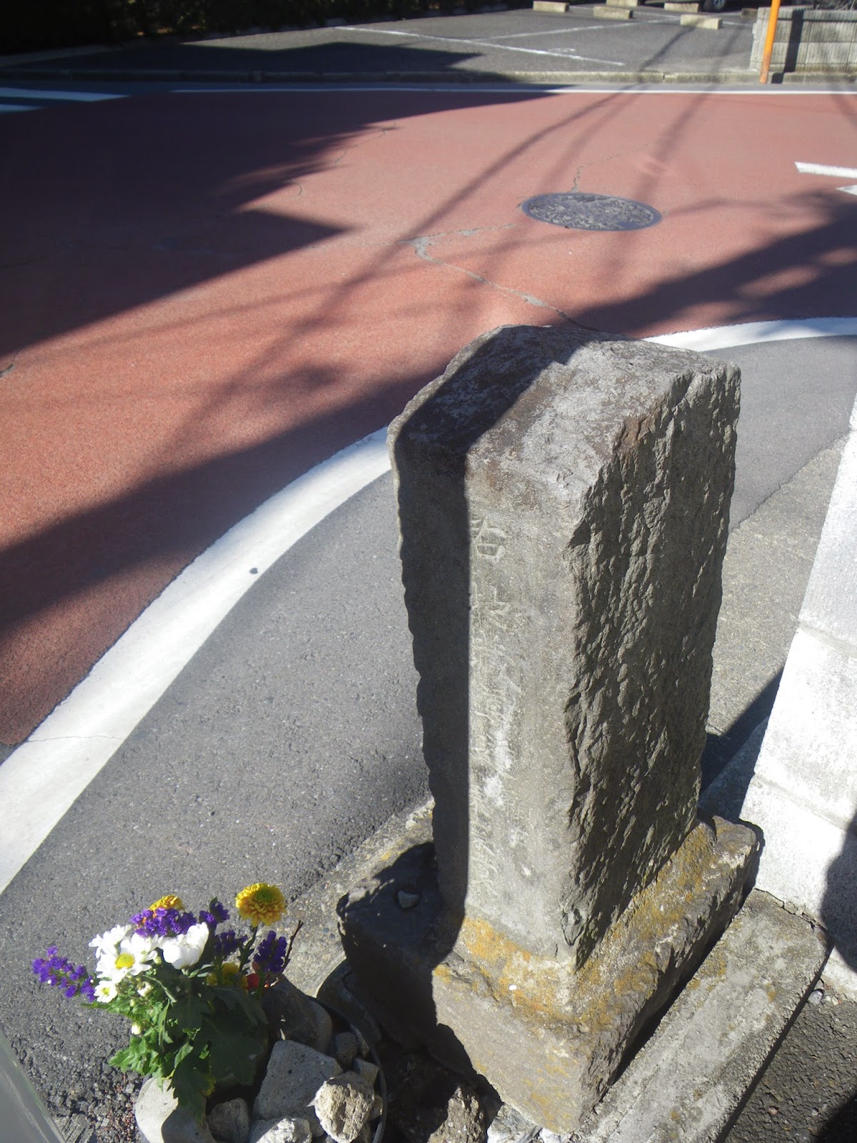 狛江道に戻る。少し東に進むと道は分岐し、道標がある。文政10年(1827)の馬頭観音とのことだが、風雪に摩耗している。その道標脇に丸石があり、そこに「西 府中道 右 地蔵尊 渡し場道 左 江戸青山 六郷道」とあった。道標には、そういった文字が刻まれているのだろう。