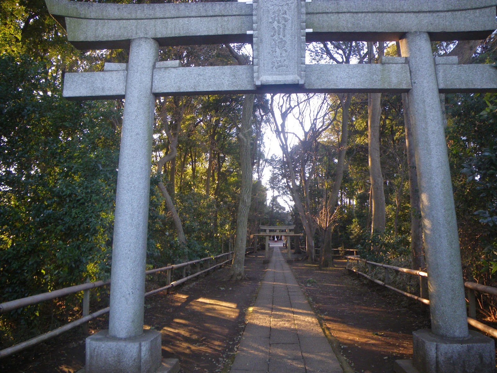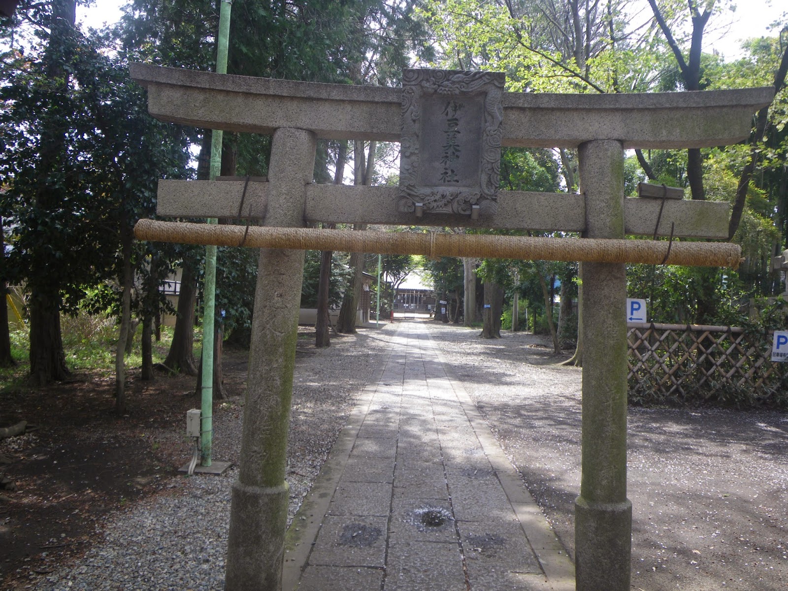 道なりに進むと伊豆美神社の社叢が見える。鳥居を潜り境内に入ると、参道に小さな鳥居が建つ。二の鳥居と称される。