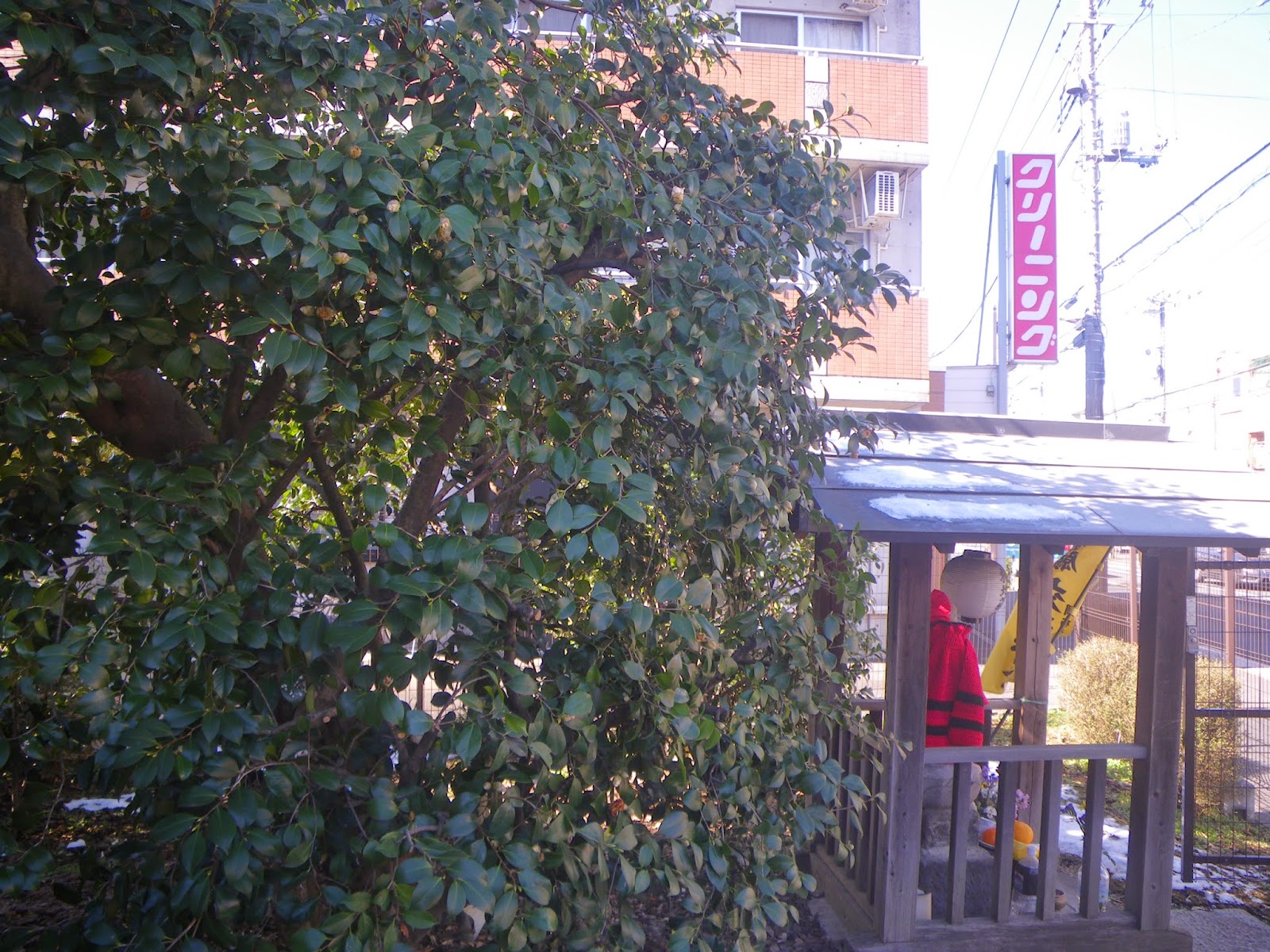 ツバキは高さは約5メートル、東西7メートル、南北8メートルもの大きなものであったようだが、現在は、まことにささやかな茂みとして残っていた。