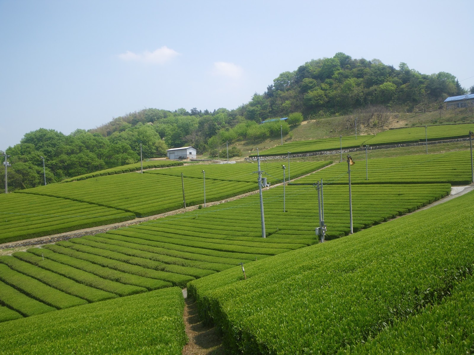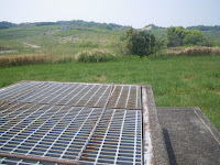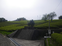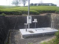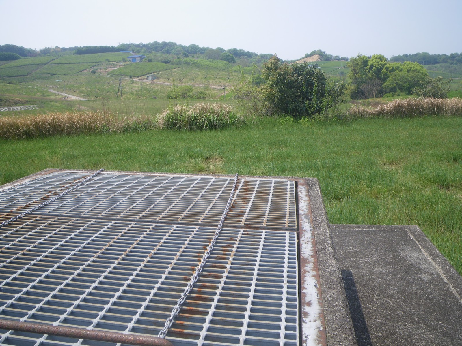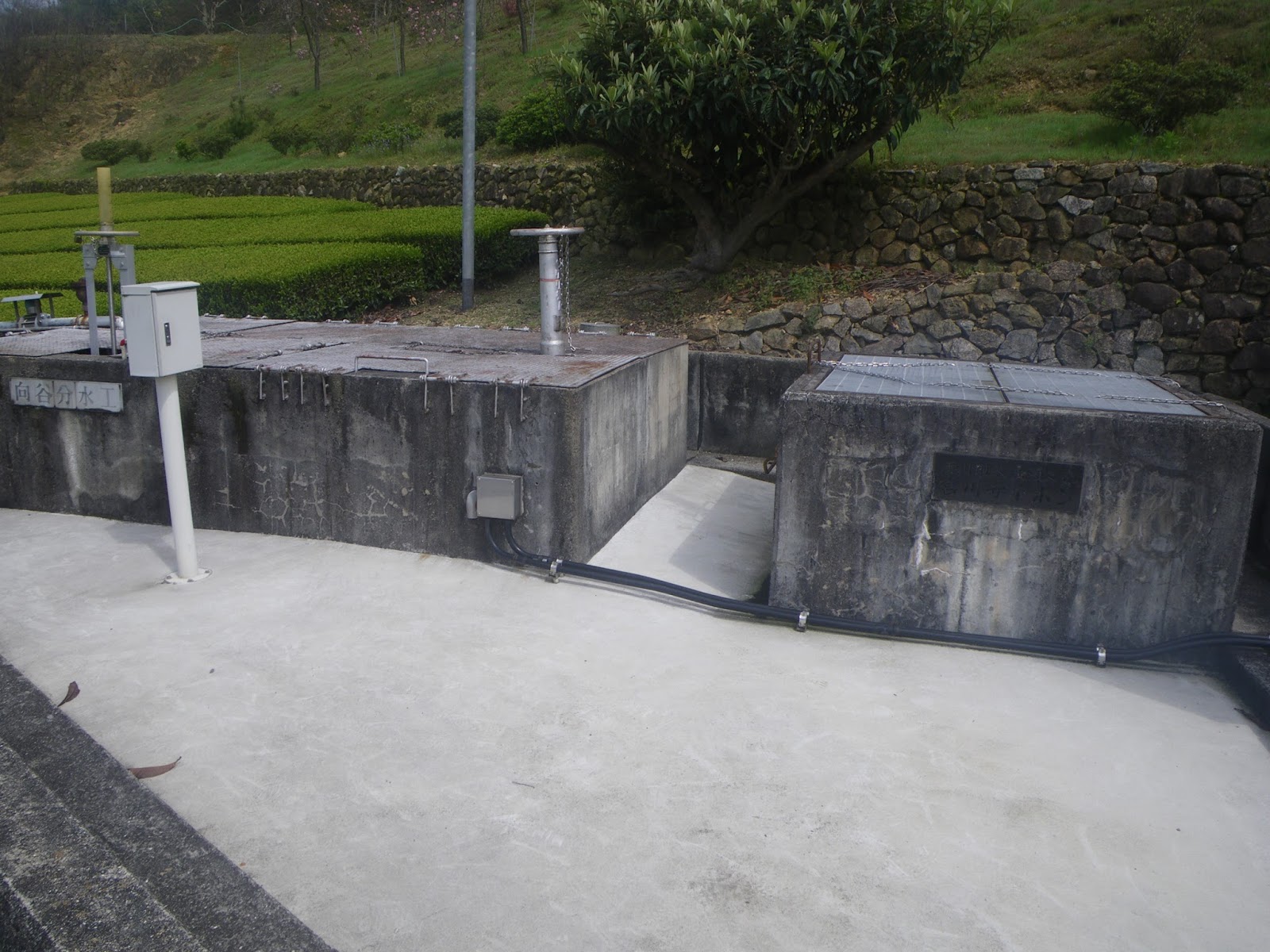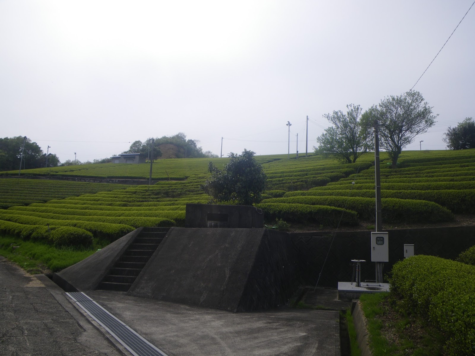 尾根道を進み、チェック地点に。が、そこは単なる倉庫であった。少々ガックリしながら、前面に拡がる茶畑の写真を撮ろうと倉庫からほんの少し先に進むと、倉庫のすぐ下に水路施設らしきものが見える。泥濘で靴をぐちゃぐちゃにしながら、それでも少しでも乾いた箇所を見付けて水路施設に足を付ける。そこには「玉田サイフォン」と記されていた。
