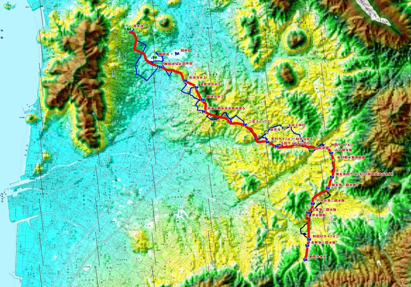 第二回;神田サイフォン>玉田サイフォン入口>玉田サイフォン・玉田分水工>宮川サイフォン・向谷分水工>二宮チェック工>トンネルに入る>東長谷分水工>高速を渡る用水の送水管>脇池分水工>清見池分水工>長池分水工>勝田池分水工>高室分水工・国市局>満水池