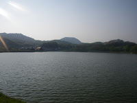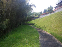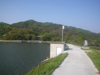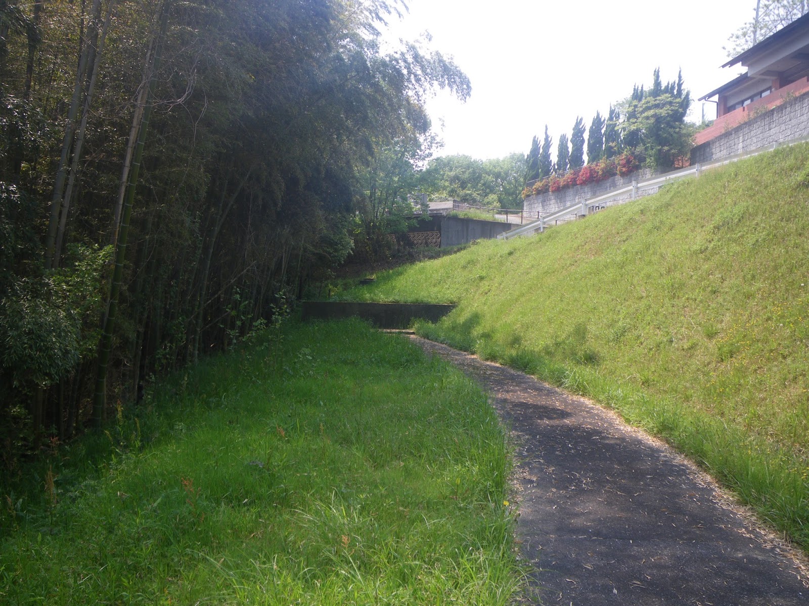 道を左手に入ったすぐのところにある池脇のスペースに車をデポし、衛星写真でチェックした水路施設らしき箇所を目指す。竹藪の茂る道を上ると丘陵の尾根道になり、左右の景色が開ける。左手は谷、右手は丘陵が続く。