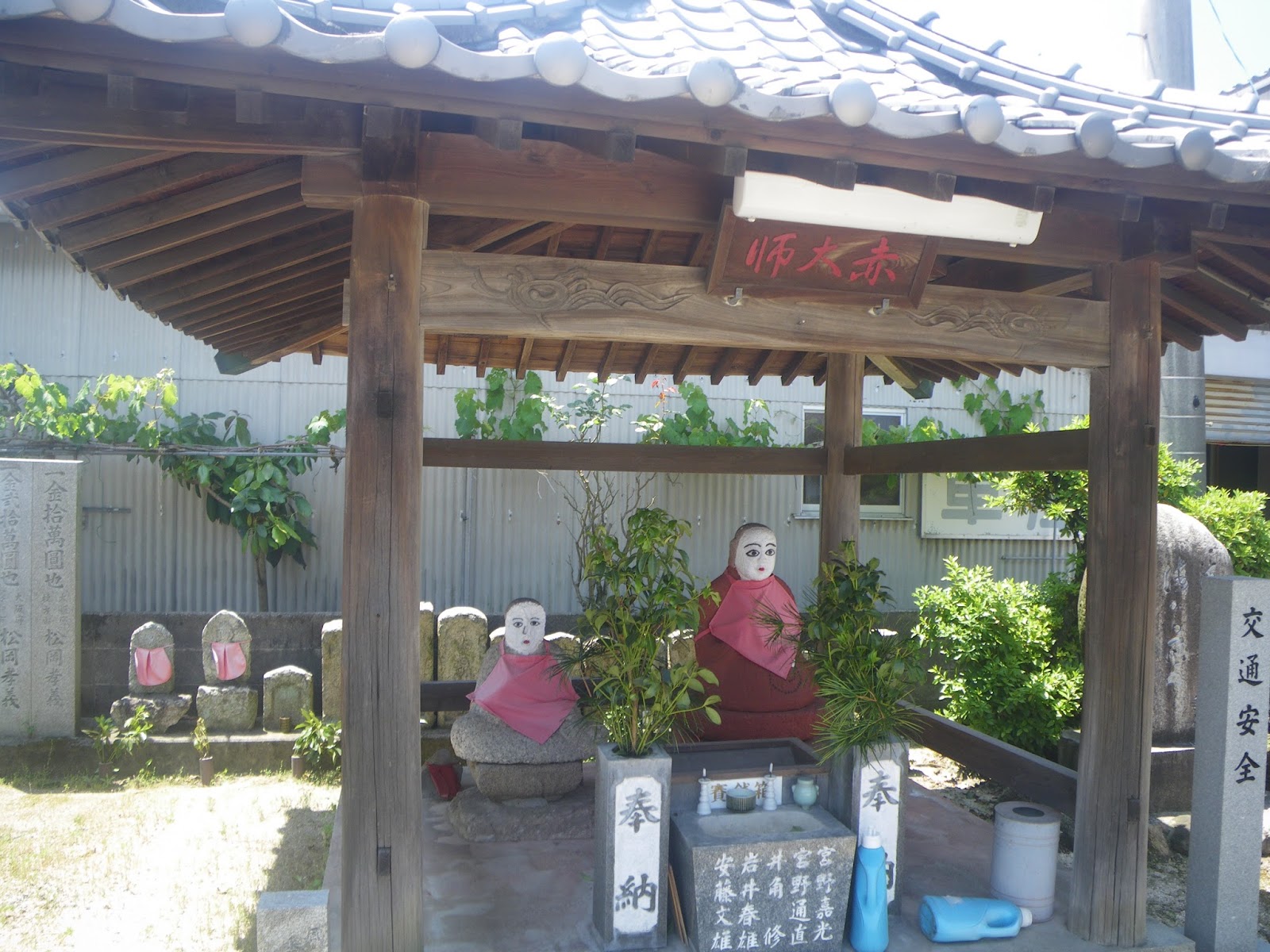 案内「赤大師(赤地蔵さま)藩政時代に北条市上辻の庵(津地医王山薬師堂の煉瓦に河野家の定紋・隅折敷縮波三)に祀られてあった地蔵尊をどのようないきさつからか、松並木街道(現在の国道196号線)に移し祀るようになった。