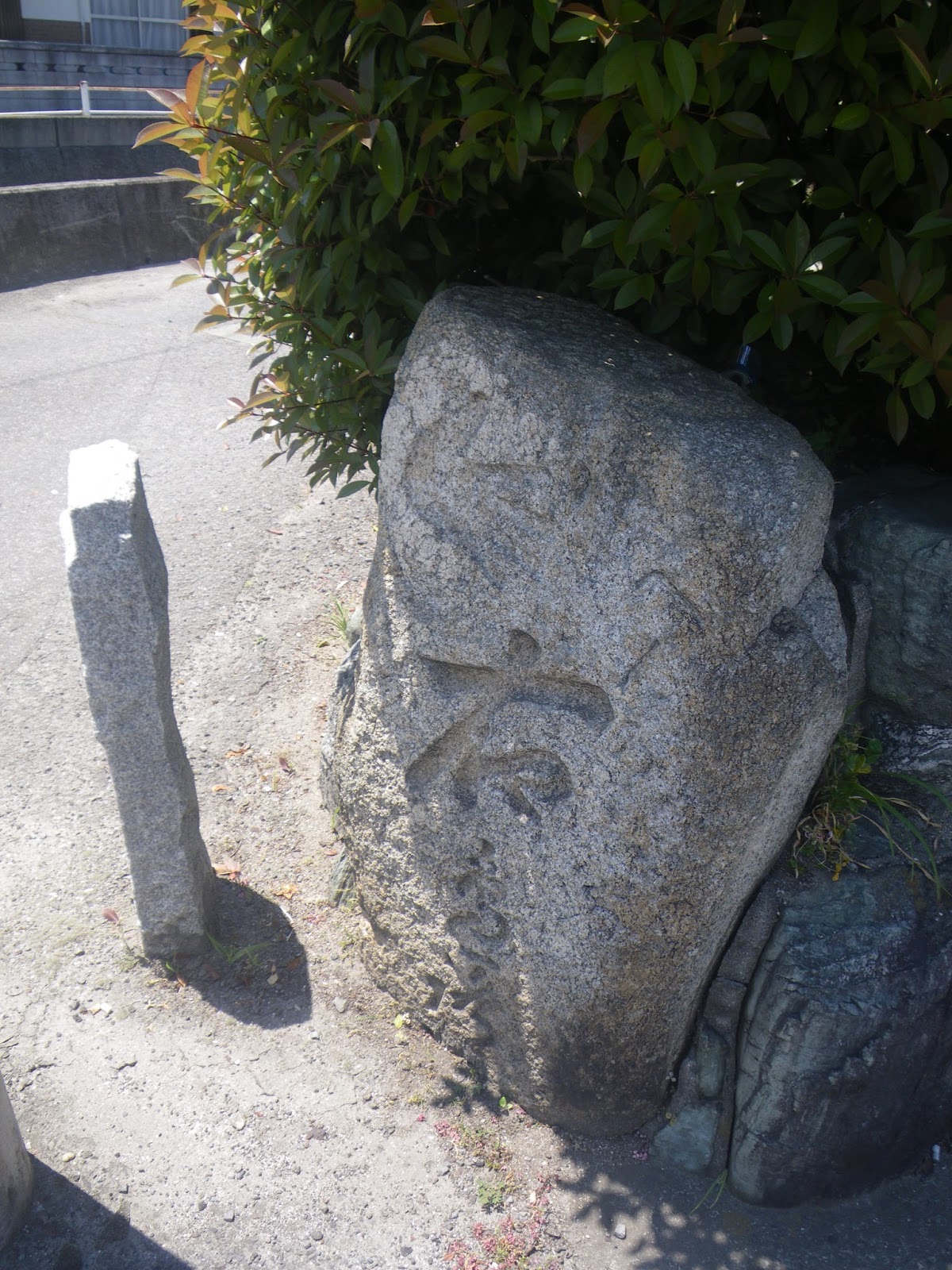 札所五三番・円明寺にも「切支丹灯ろう」があったが、柳原から府中地区にかけて「弥エ門の墓」の間には、田圃の曲がり角に14基ほどの切支丹の石地蔵が建つとのことである。