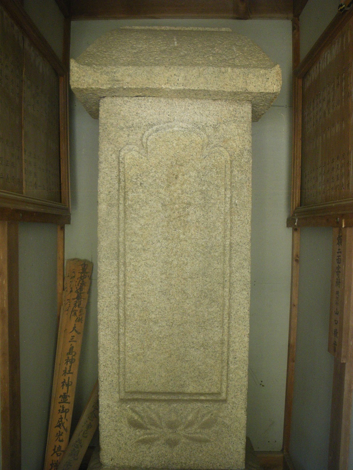 境内には金比羅道標も建つ。20cmほどの四角の石碑で高さ50cmほど。花崗岩には正面に「こんぴら大門より三十四里」と刻まれた文字かかろうじて読める。施主風早郡新屋又次郎・世話人野間郡紺原町□□、と刻まれているとのことである。