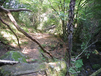で、この滝はとてもではないが上れそうにない。左岸を登山道が巻く、とのことであるので、滝壺辺りから少し這い上がって登山道を探すが、見つからない。即撤退し、滝手前にある木橋を渡り、登山道を進み滝を巻くことにする。 道は滝から離れて大きく巻いていた。滝壺から這い上がらず正解であった。ぐるりと高巻きする登山道を上り切ると木の桟道があり、そこが滝上。滝の落ち口を見に沢に入り、怖々滝上からの眺めを楽しむ。
