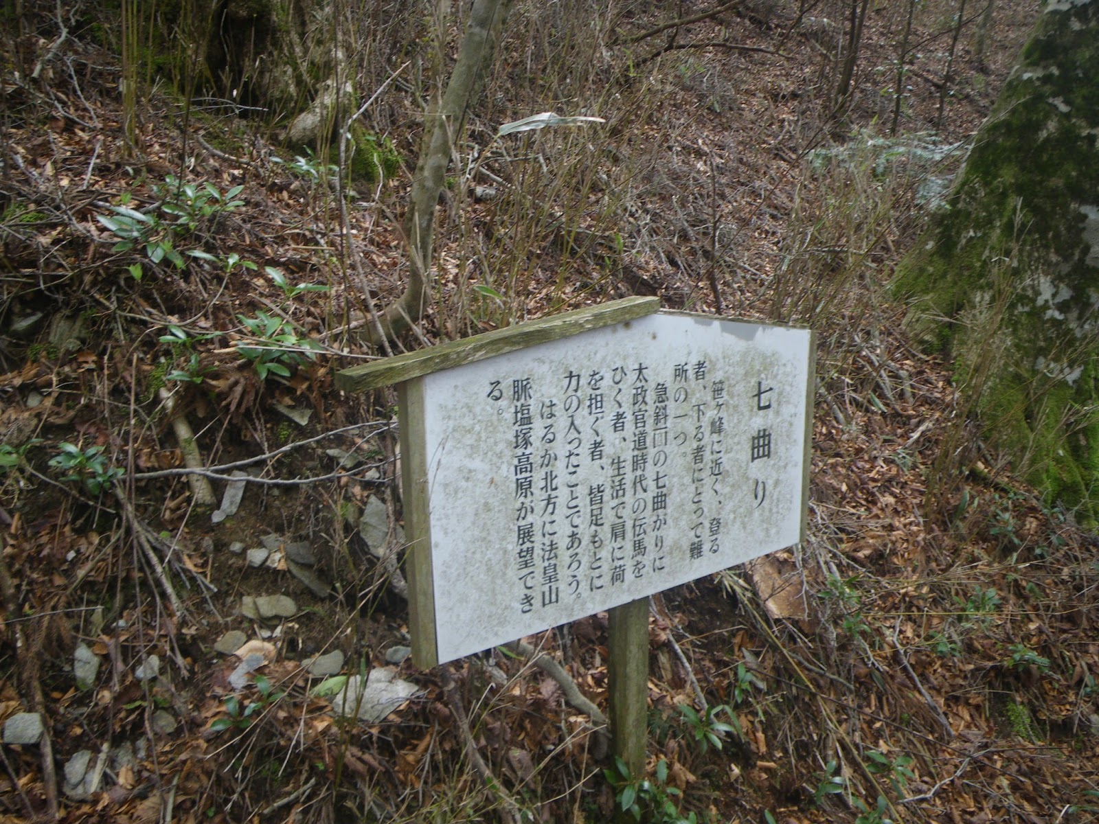 等高線をチェックすると1015mの笹ヶ峰峠から尾根路を下る街道は、標高970mから915mにかけて、尾根を右に左に折れて進み標高915m辺りから再び尾根筋を進む事になる。この間を七曲がりと称するのだろう。曲がりが多いのはここの標高970mから915mにかけて等高線が密になっており、曲がりくねって進まなければ牛馬が進めなかったのだろう、か。