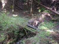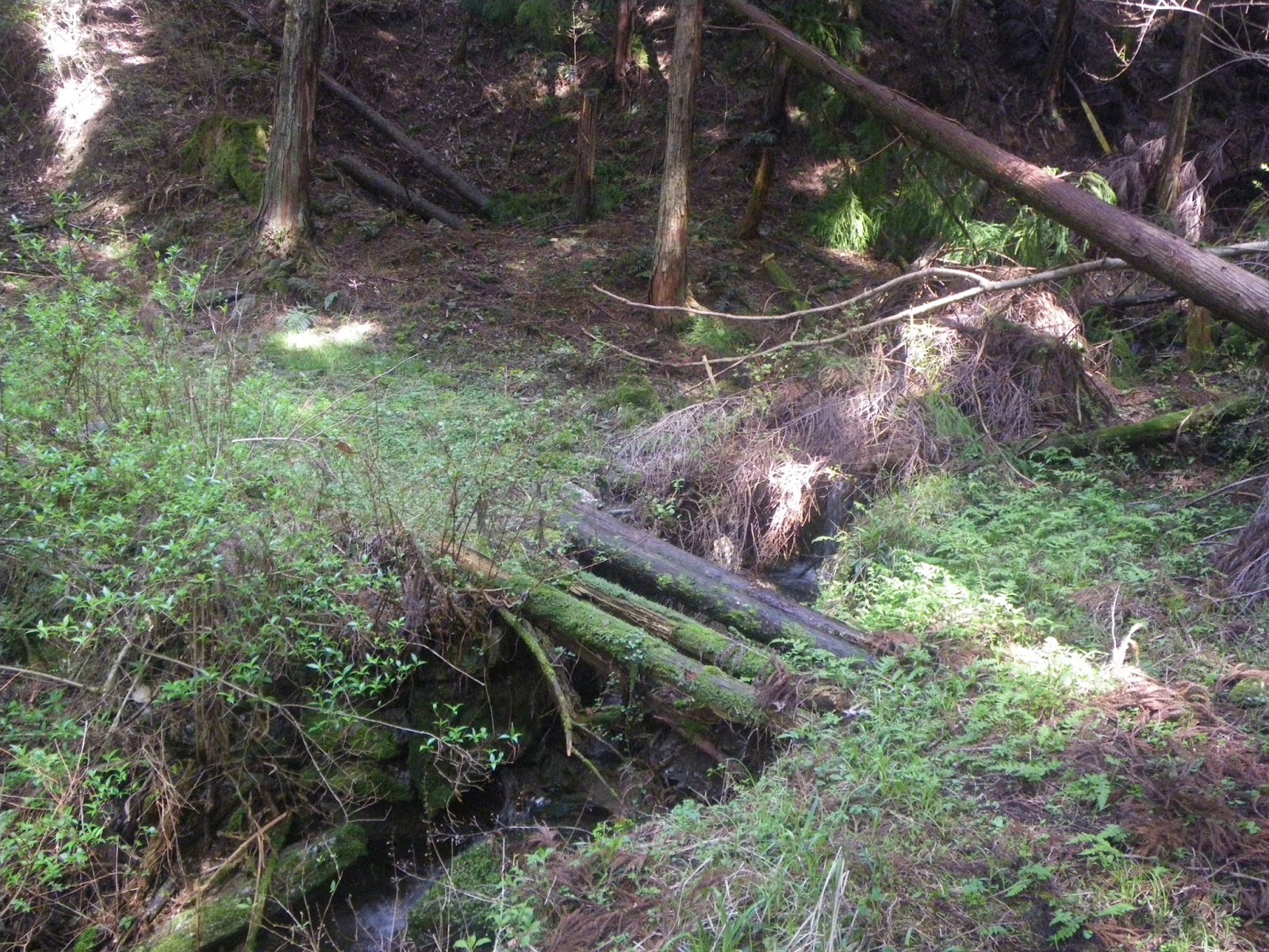 成り行きで進むが、左手に切り込んだ沢筋がある。沢を越えられるあたりまで切れ込んだ沢を上り、細まった沢の箇所を渡る。その先もそれらしき道筋は見えない。すべて成り行きで、藪漕ぎをしながら進むとまた、ちょっとした平場に出る。