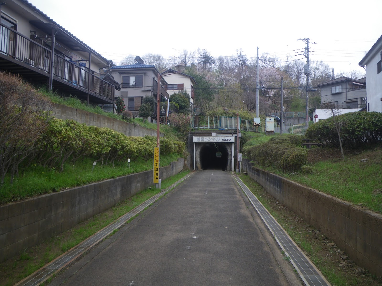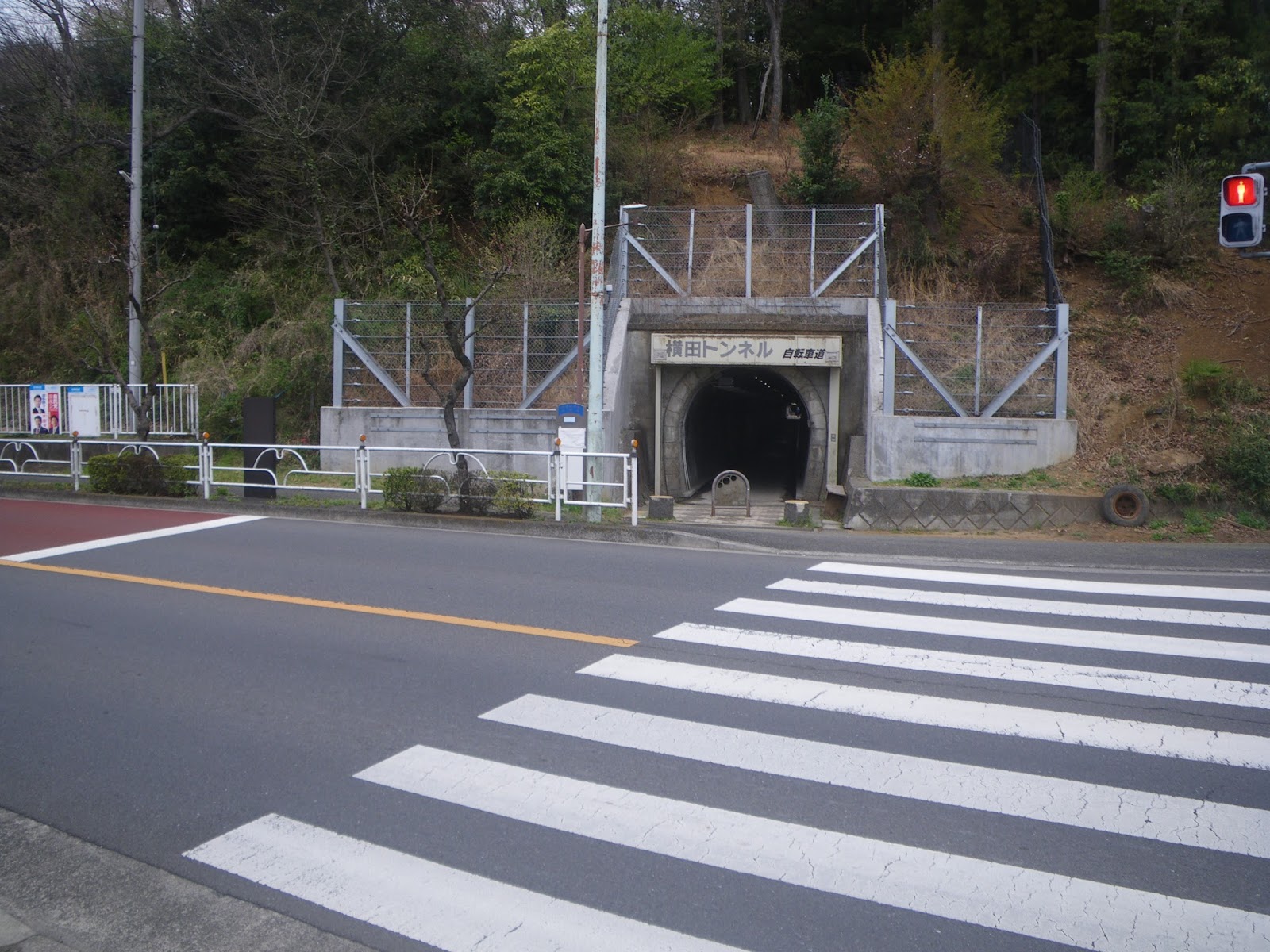 野山北公園自転車道を進み、都道55号とクロスする先にトンネルが見える。それが最初の隧道である1号隧道(横田トンネル)。夕刻にはシャッターが閉じられるようだ。