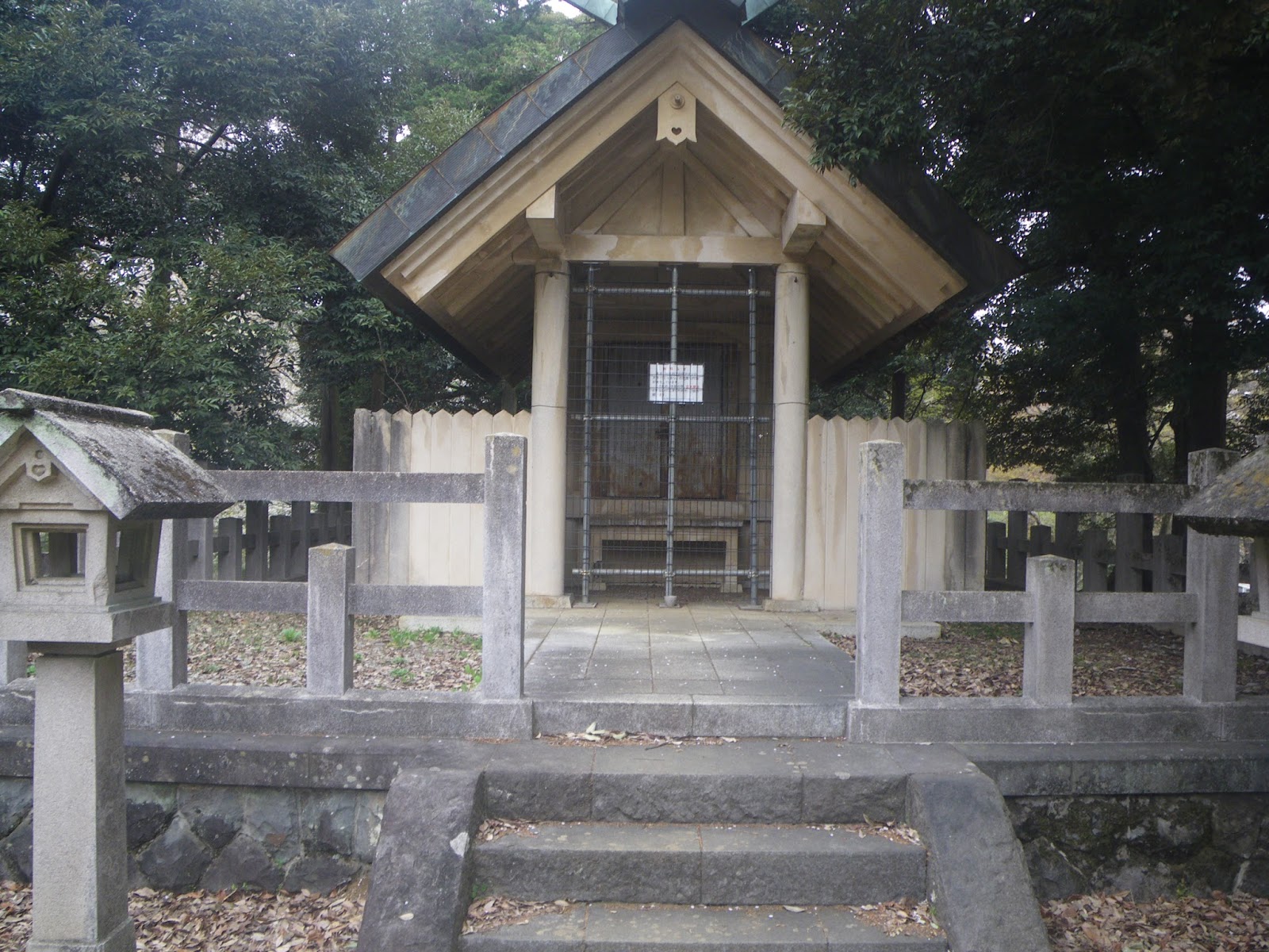 フェンスに沿って進むと周遊道路に出合った。出合ったのはいいのだが、結構高い石垣に阻まれる。フェンス横の石垣に木が立て掛けられている。誰かが、この石垣を登るため置いたものだろう。取り敢えず木に取り付いてみるが、微妙に石垣上端へと取り付きが足りず、さて、と思っていると、その隙に木登りなど勘弁と思ったパーティ諸氏が石垣下を進み、周遊道路に簡単に登れる箇所を見付け、さっさと周遊道路に登っていった。私も後を追う。