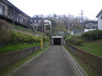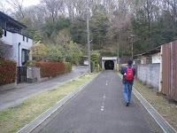 そのまま森林に、と葉思えども、緩やかにカーブする道を進むと、車道にあたり、周辺に宅地が見える。隧道には車道にあたる箇所で直角に曲がり進むことになる。