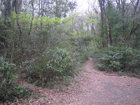 100mほどの隧道を抜けるとその先に車止めがあり、自転車道はここで終わる。車止めの先で道は左右、そして直進と3方向に分かれる。5号隧道は、道を直進することになる。ここから先は丘陵地の緑に包まれる。