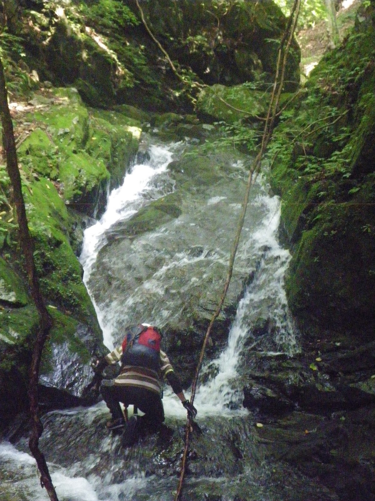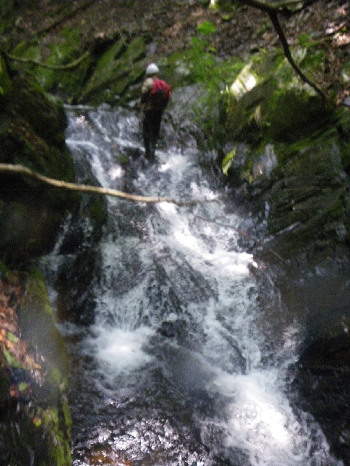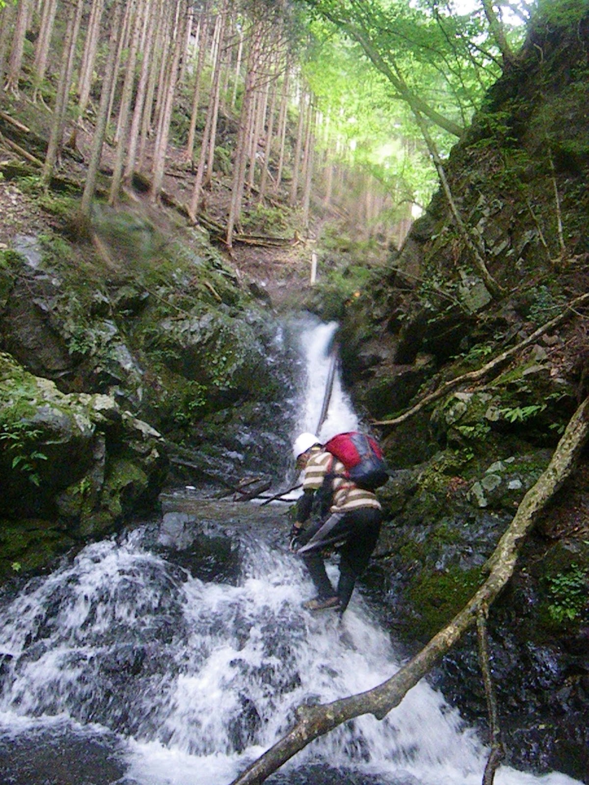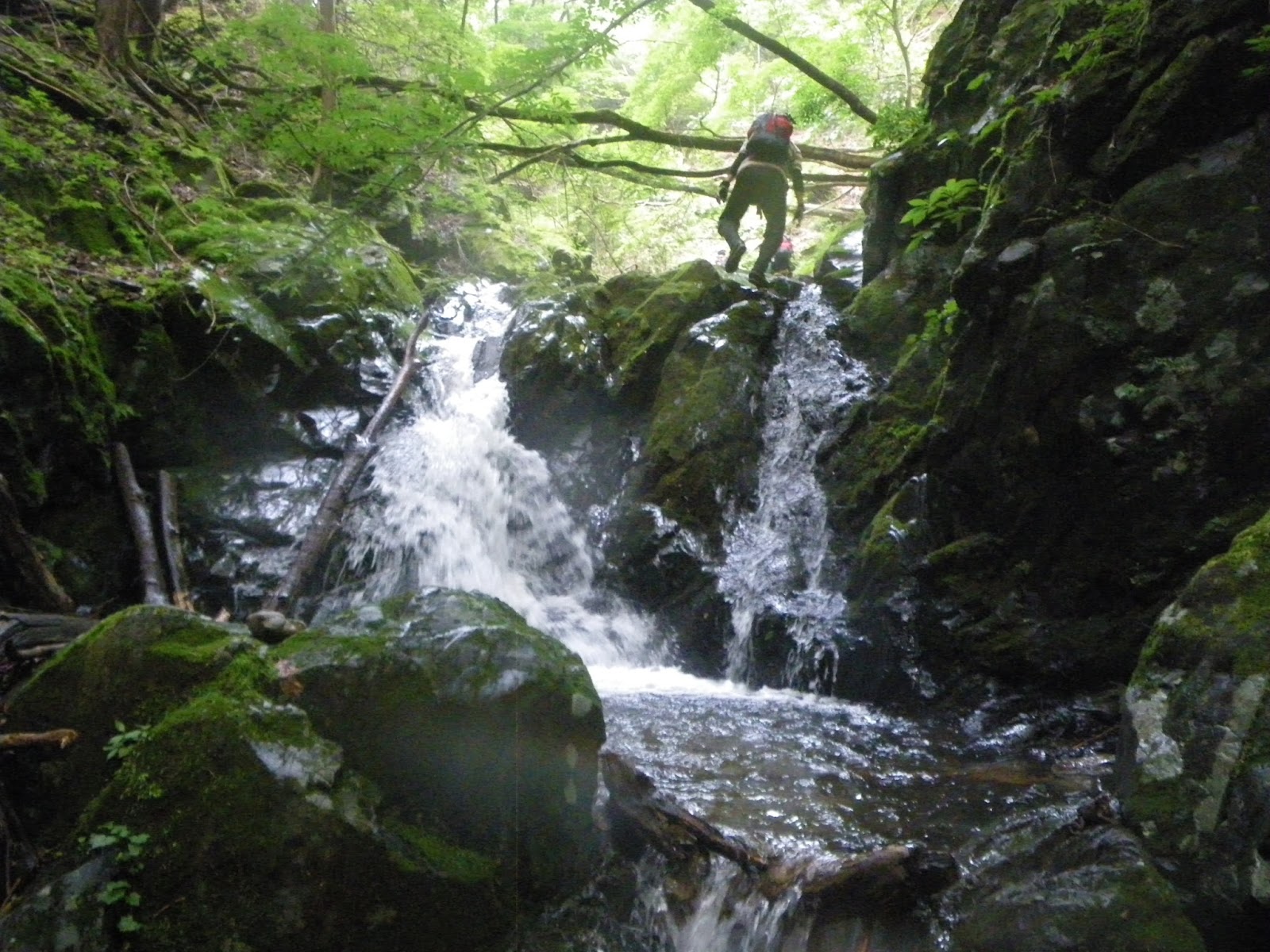 二股でお昼を取り、12時40分前に出発。二股を離れほどなく数段からなる滝を登る。下段はナメ状、その先は2mほどの小滝。ナメは水線上を、小滝は右岸を上る。
