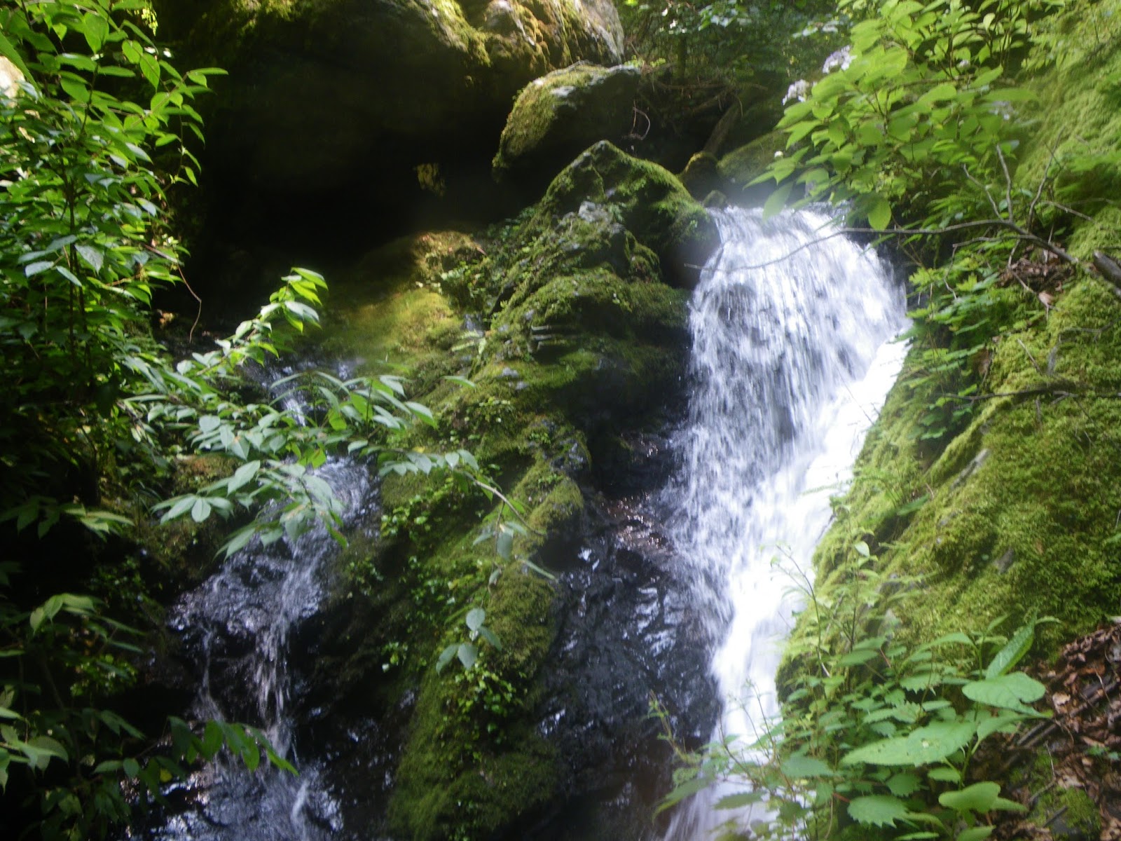 15分ほど沢を突き上げると、釜をもつ2条3mの滝。ここの釜は浅そうであり、右岸を這い上がる