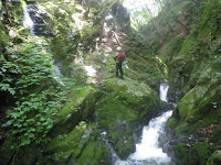 釜を持つ3mの滝を越えるとゴルジュ、と言うか、狭隘な谷に挟まれ大岩から流れ落ちる水線を這い上がる。小滝というより岩を避けて流れ落ちる水流といった風情。幾つもの大岩の右や左から流れ落ちる水線中を這い上がる。いかにも沢を突き上げている感がある。