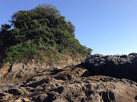 道を進むと、丘陵突端部は少し藪にはなっているが、切り通しとなっており、一周することができた。ついでのことでもあるので、案内にあった「さん橋跡の柱穴(ピット)」を見るため岩礁部に。いままで来島や小島で満潮のために見ることにできなかったピットにはじめて出合えた。