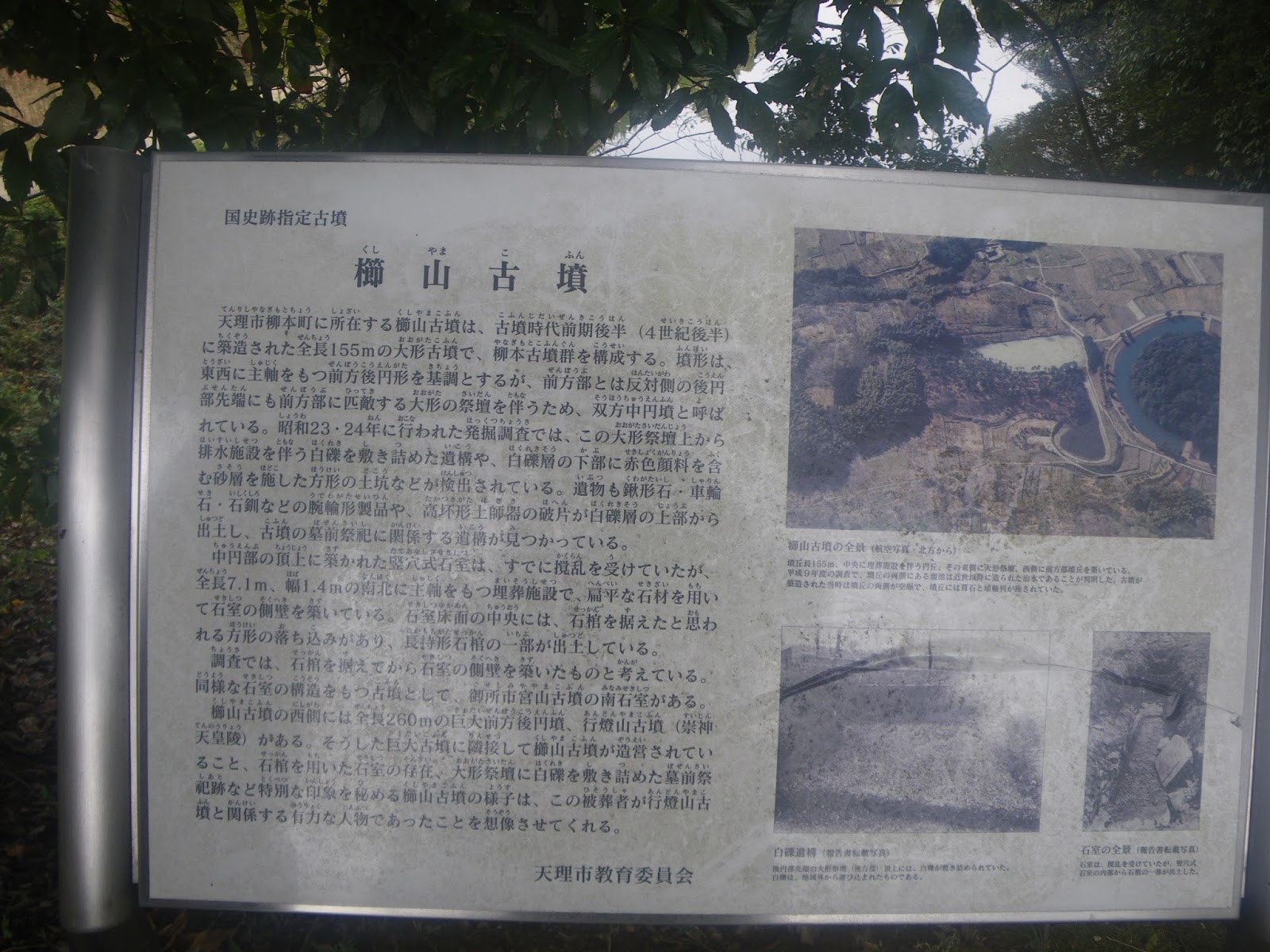 道端にあった案内(位置的には行燈山古墳の案内より先にあり、どちらが櫛山古墳か少し混乱したが)には、「天理市柳本町に所在する櫛山古墳は、古墳時代前期後半(4世紀後半)に築造された全長155メートルの大形古墳で、柳本古墳群を構成する。墳形は、東西に主軸をもつ前方後円形を基調とするが、前方部とは反対側の後円部先端にも前方部に匹敵する大形の祭壇を伴うため、双方中円墳と呼ばれている。