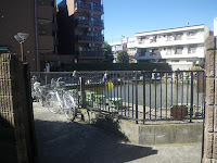 杉並第七小学校手前で水路跡は狭くなく。この先行き止まり、との案内があったが、とりあえず進むも小学校の塀で行く手を阻まれる。小学校の校庭を通っているようだ。