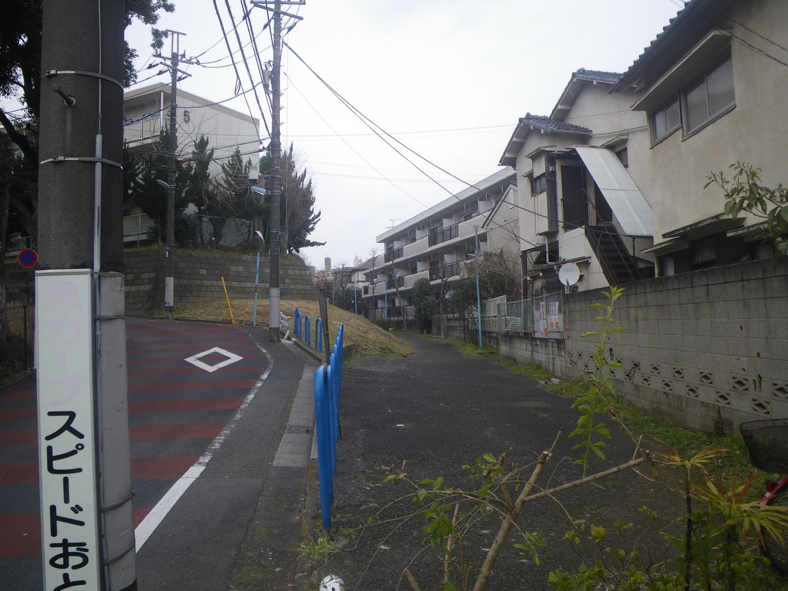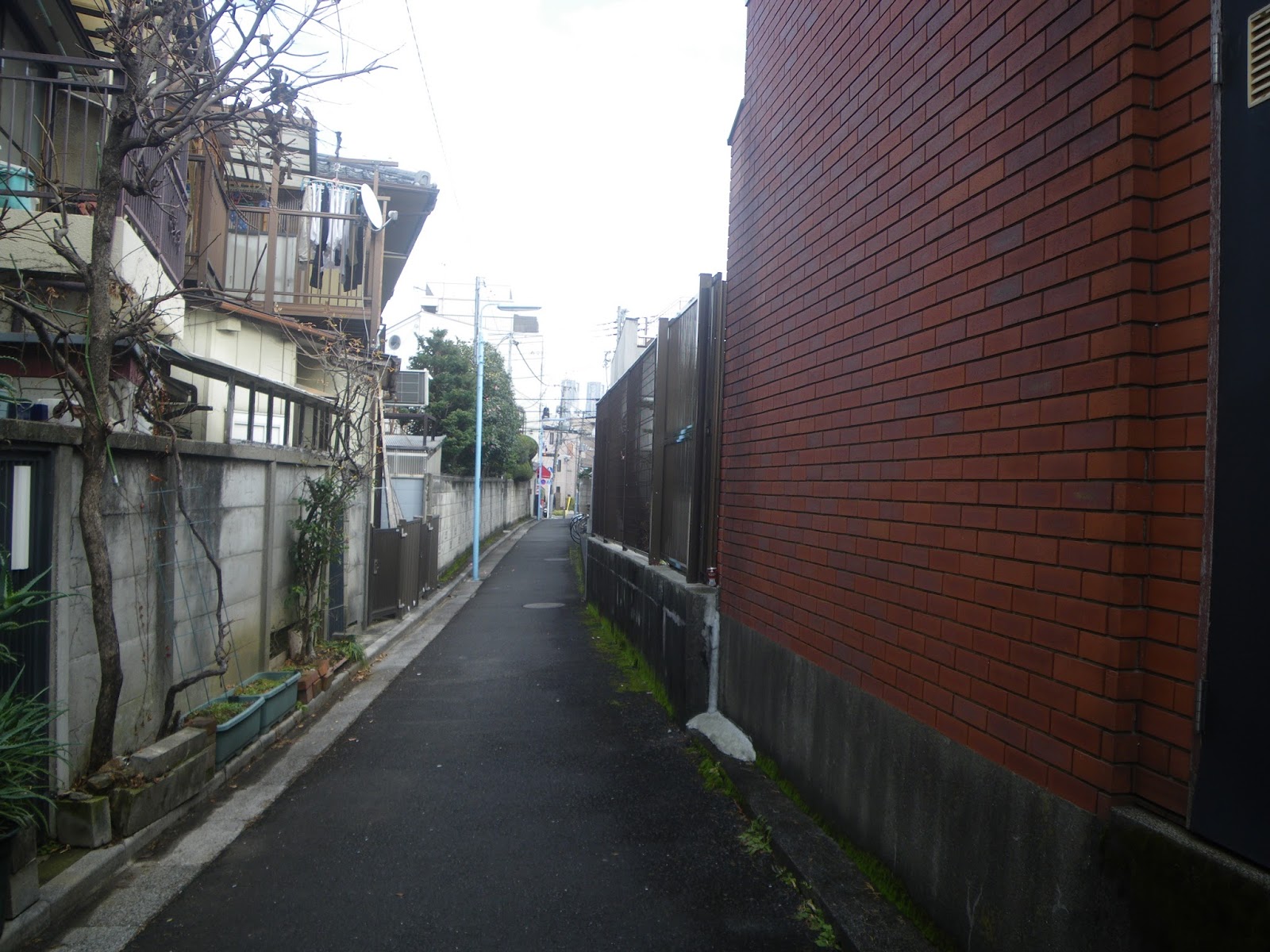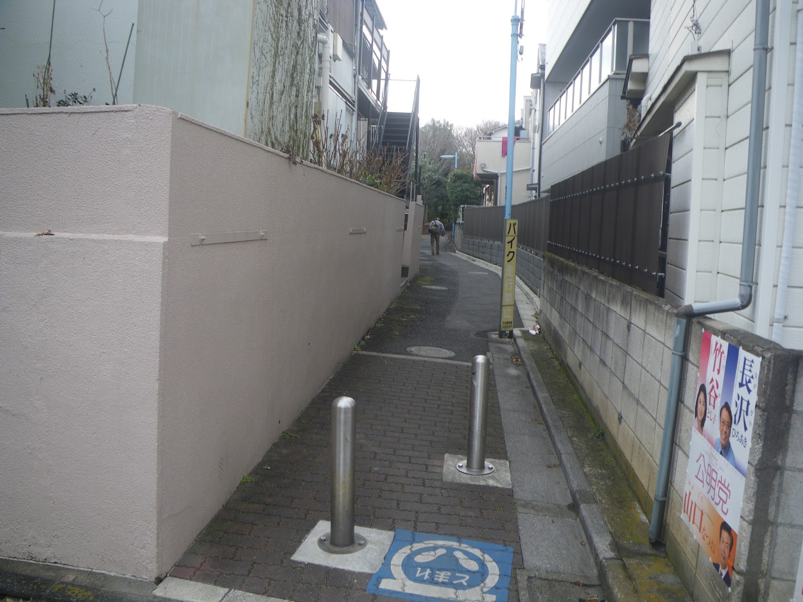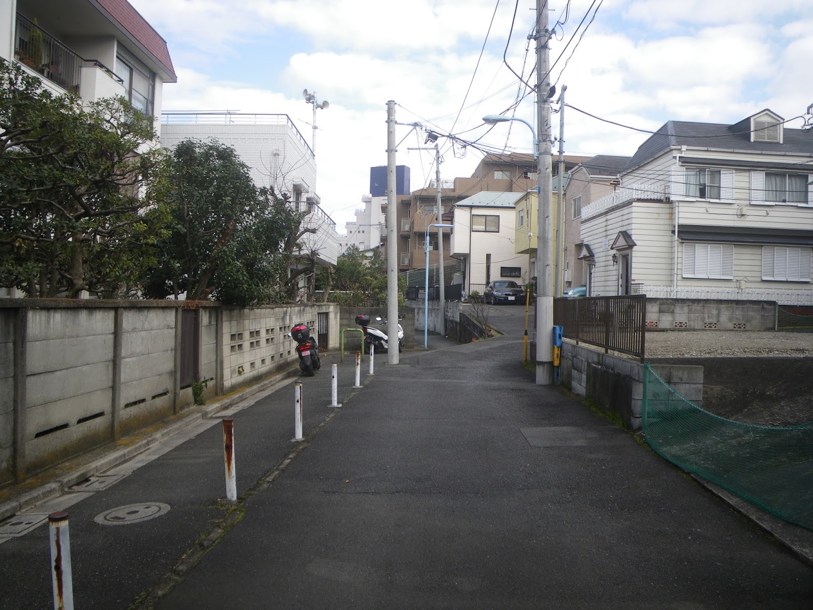 この辺りから、神田川へと下ったのであろうから、なにか痕跡がないものかと四差路を少し西に進む。と、角の9階か10階建のマンションの西に、水路によくあるポールの建つ細路がある。