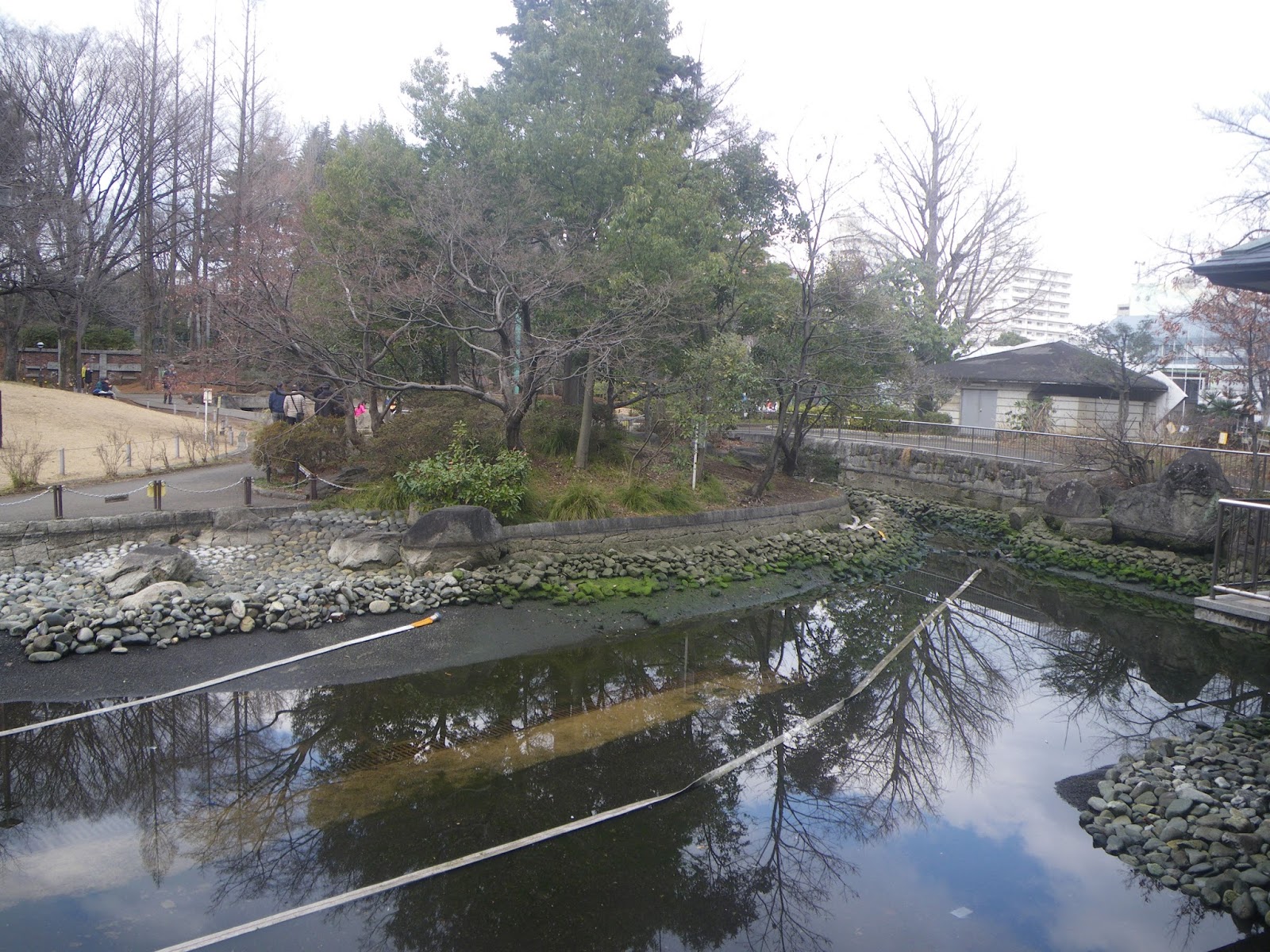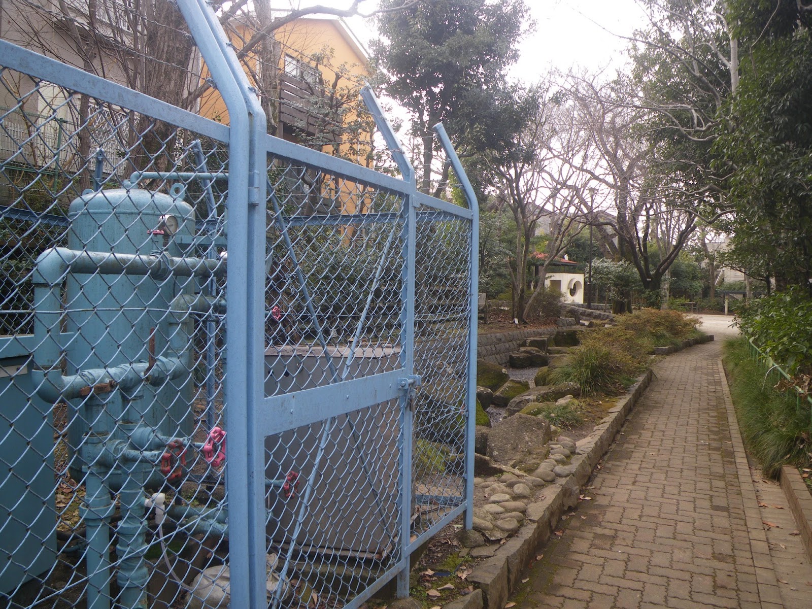 が、なんとか池が見えないものかと、お寺さまと環七の間にある梅里公園の南端に沿って続く、お寺様の立派な塀に沿って西に進む。道が行き止まりとなった辺りに汲みあげポンプがあったり、お寺さまから流れ出るコンクリート造りの水樋があったりと、「水気」を感じる。地図を見ると公園西端に接する境内に池が見える。公園の石組みの段差を上り、境内を見ると池が見えた。それが新鏡ヶ池ではあろう。
