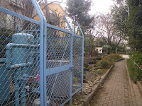 道なりに進み、「高南中学校」の塀に沿って進む。なにか水路跡らしき痕跡なないものかと周囲を見遣りながら進むと、高南中学校の正面入口のすぐ東側に東に入る道がある。堀内道のところで消えた水路痕跡はないものかと、路地に入ると、車止めのパイプの先に廃屋となったアパートがあり、その前に細路が入り込んでいる。如何にも水路跡といった趣だが、その細路もすぐに行き止まりとなった。