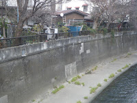 細路は神田川に続く。富士見橋からチェックすると、橋のすぐ下流に、蓋をされてはいるが神田川に注いでいたであろう箇所が確認できた。また、橋の上流には排水口が見える。どうも、雨水幹線として工事が行われ、もとの下流排水口に続く流れを神田川に注ぐ手前で、上流の排水口に付け替えられたようである。