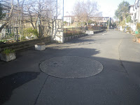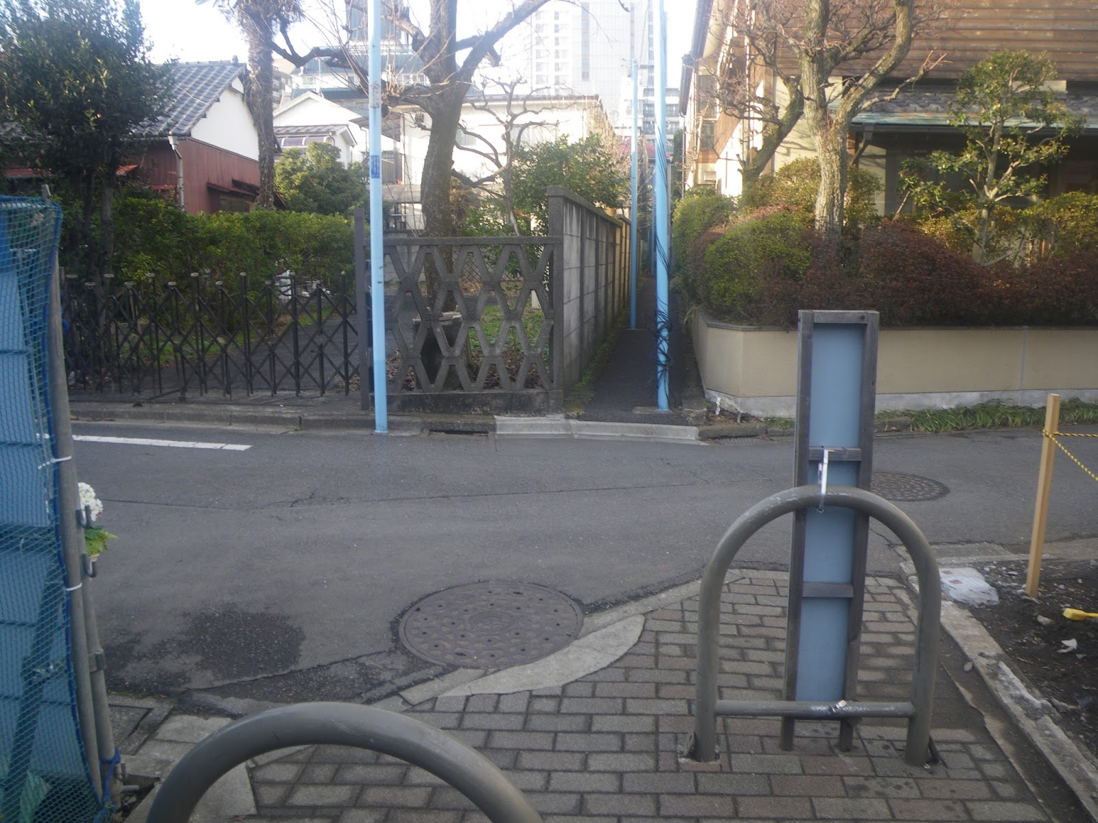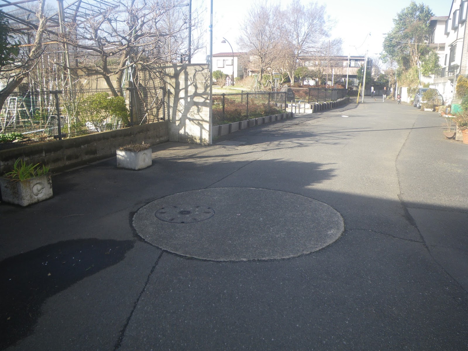 迂回し、水路跡の道筋に回り込む。回り込んだ民家の間の道にはマンホールが見えるが、民家の間の道といった趣で水路跡といったものではない。 何かしら痕跡はないものかと、少し北に進むとコンクリート蓋に覆われた暗渠が登場するが、通行禁止となっている。暗渠を進めば中央図書館脇の池の辺りに繋がりそう、ということを確認し、分岐点へと戻る。