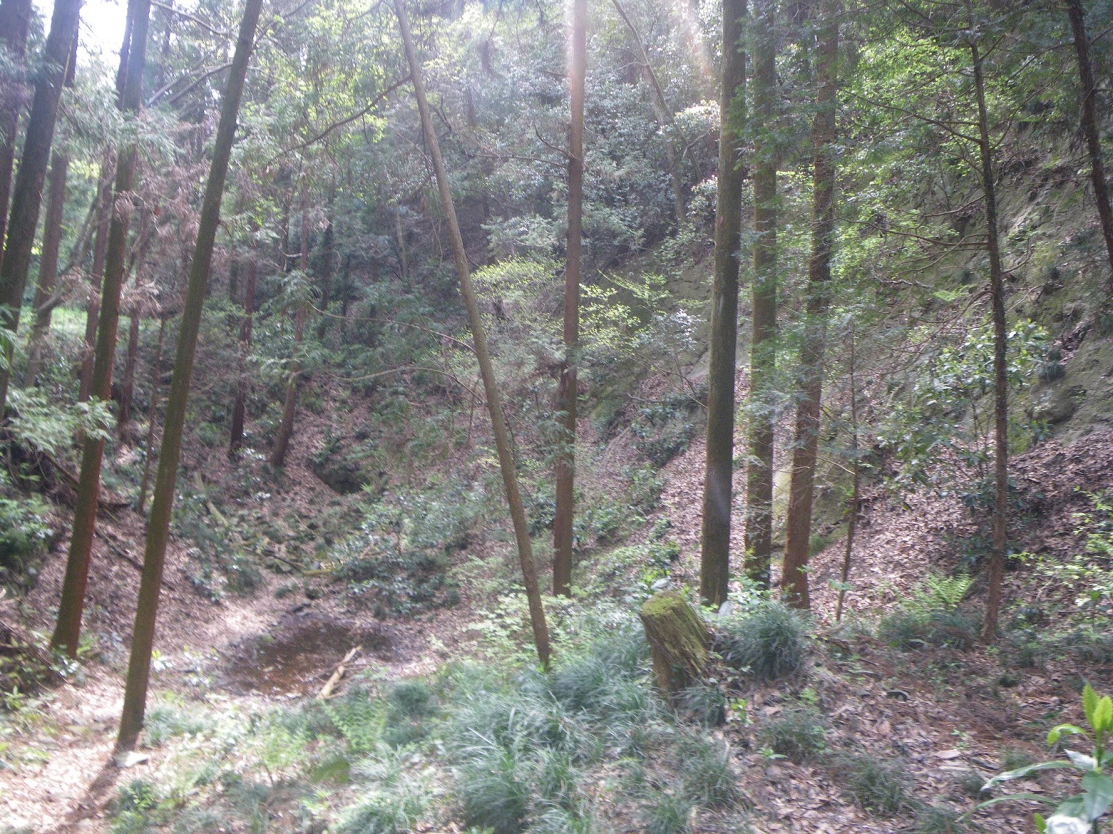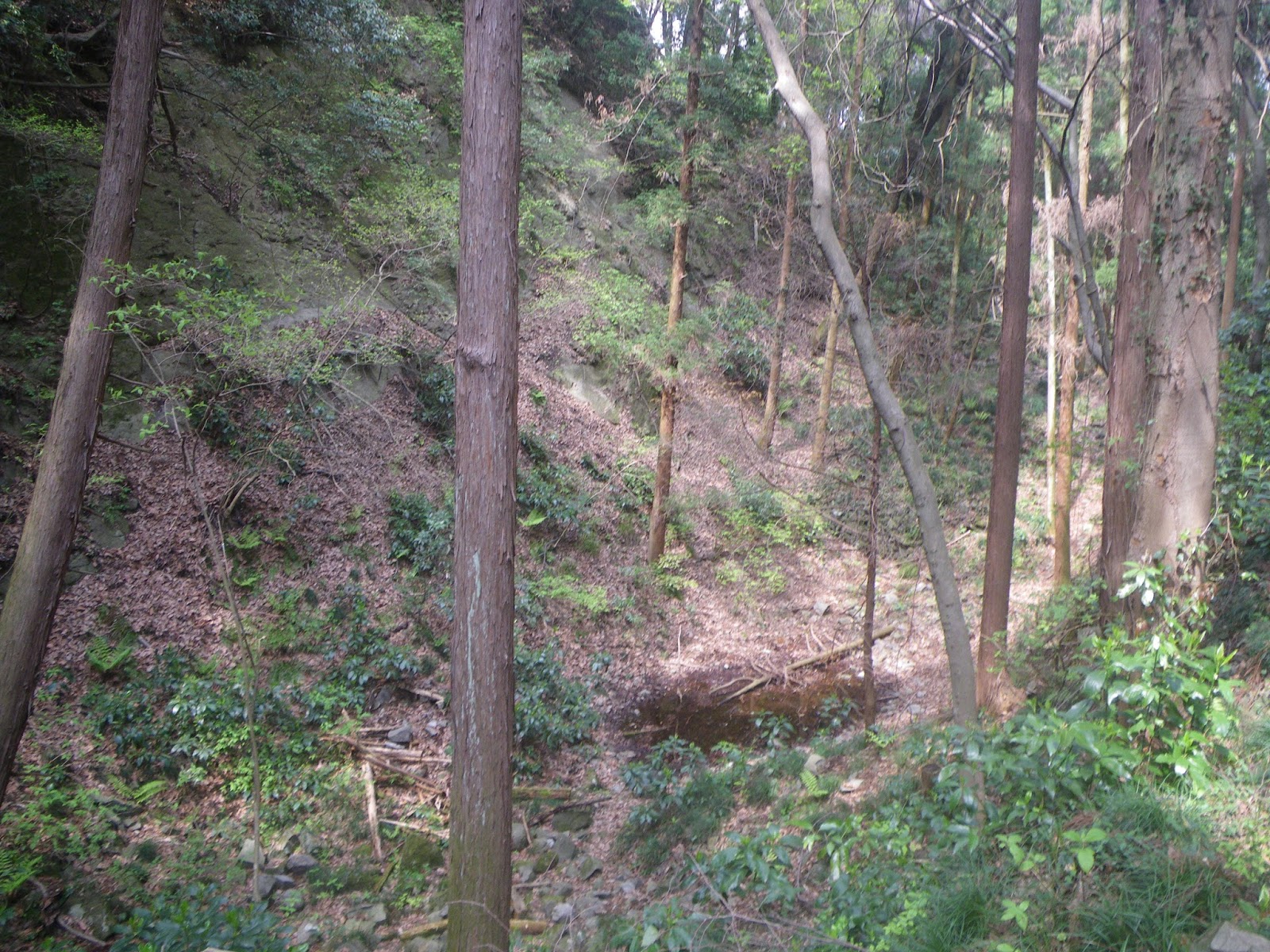 案内板の先が大きな窪地となっており、そこが石切場跡のようである。露天堀で掘り割っていたのだろから、山塊を掘り込んだ結果、窪地状となったのだろう。最も深く掘り込まれた底には水が溜まっており、故に石山の池と名付けられたのではあろう。