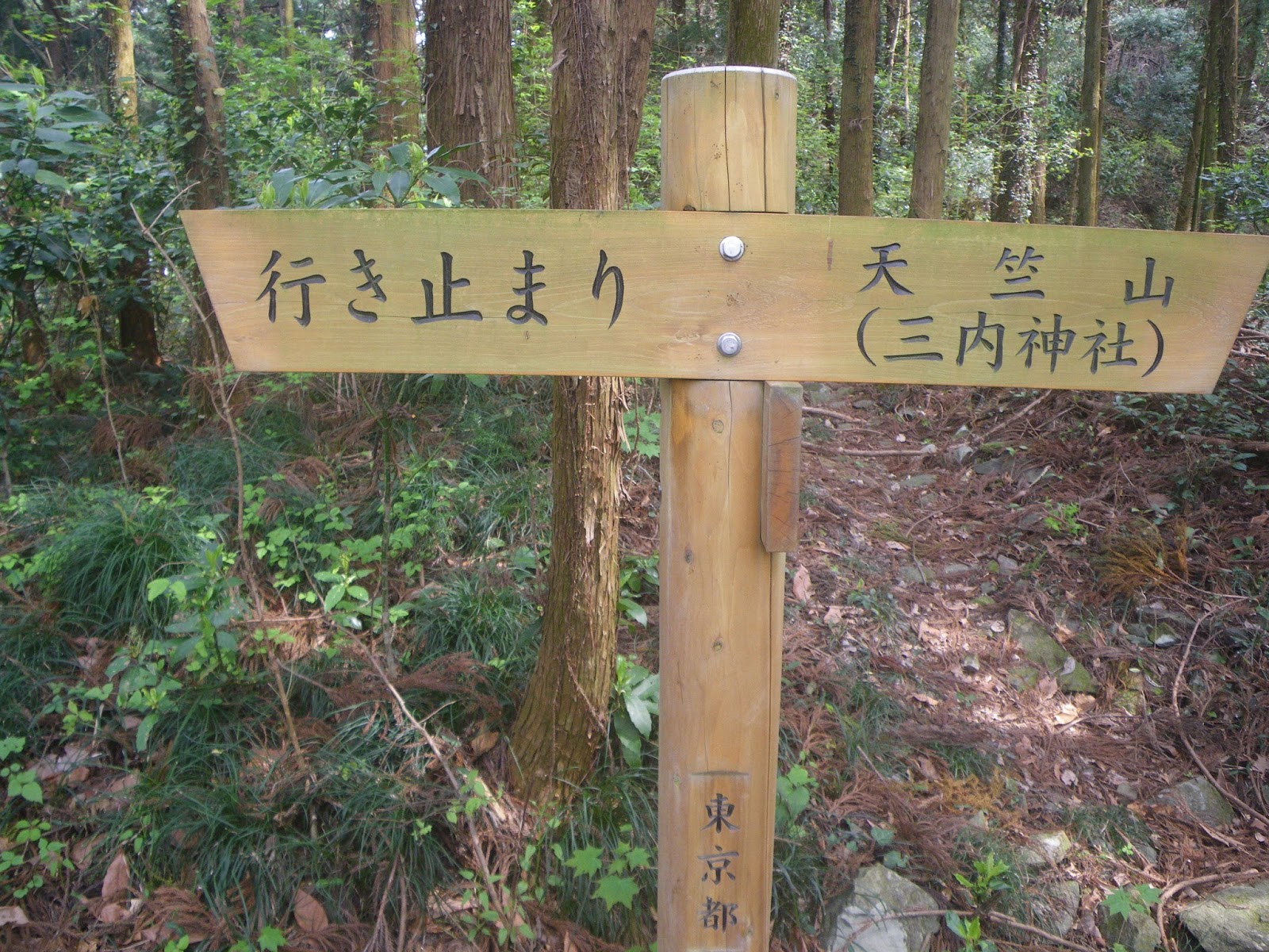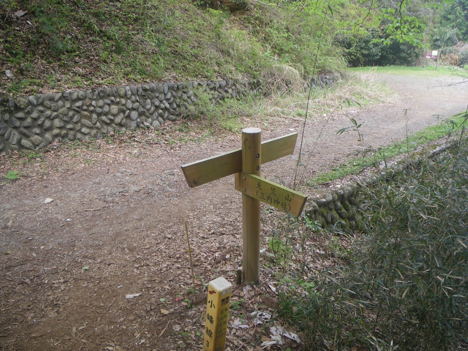 石切場跡の窪地を離れ、天竺山に向かう。道成りに進むと道標があり、左「天竺山」、右「行き止まり」とある。横沢小机林道への尾根道(横沢小机林道)が封鎖されたのだろうか?また同じ道を戻るのもウザったいので、林道へは藪漕ぎ覚悟で「行き止まり」道を進もうか、などと思いながら「天竺山」方向に向かうと、ほどなく、左「横沢・小机林道」、右「天竺山(三内神社)」の標識がある。ここが横沢西側尾根であった。