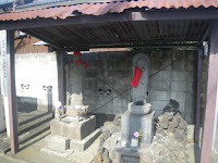 伊奈新宿バス停の少し西に「伊奈」バス停。この辺りが本宿(上宿)と新宿の境とも言われる。バス停の街道を挟んだ北、細い道脇の土手上に「塩地蔵尊 千日堂跡」がある。