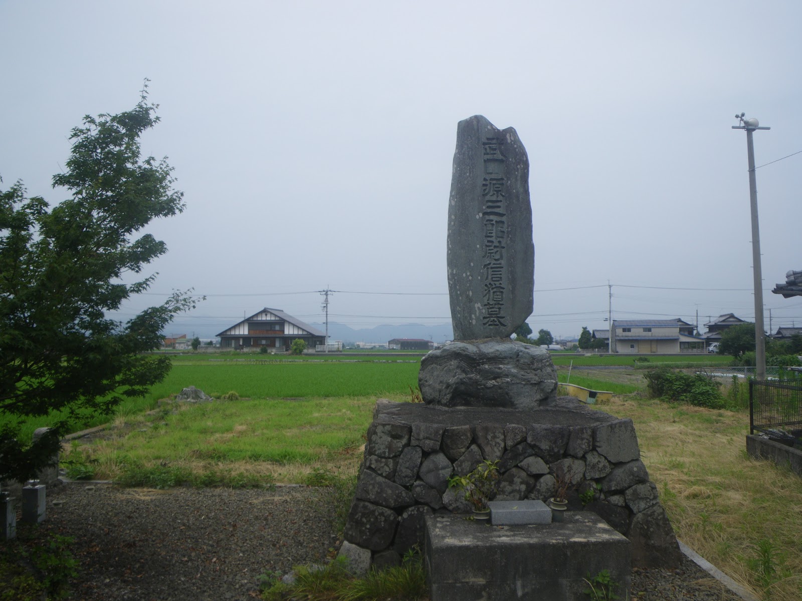 大智寺に一族の墓所があった。顕彰碑を探し大智寺近くを彷徨う。近くにはみつからない。偶然、大智寺から北東に少し歩いた、西条市石田545の辺りに武田源三郎尉信猶墓が祀られていた。