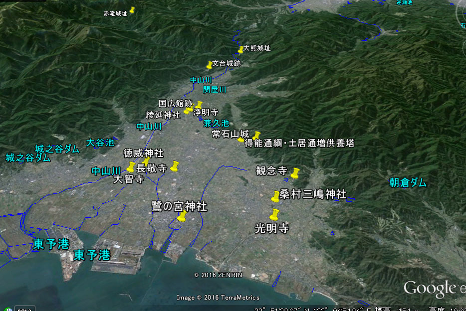 今まで東予市(一部丹原)、現在の西条市西部に残る河野氏ゆかりの地を時系列で巡ってきた。ために、場所が北へ南へ、西へ東へと飛び散っている。ここで周桑平野の地形と、それにともない開かれた集落を整理しておく。
