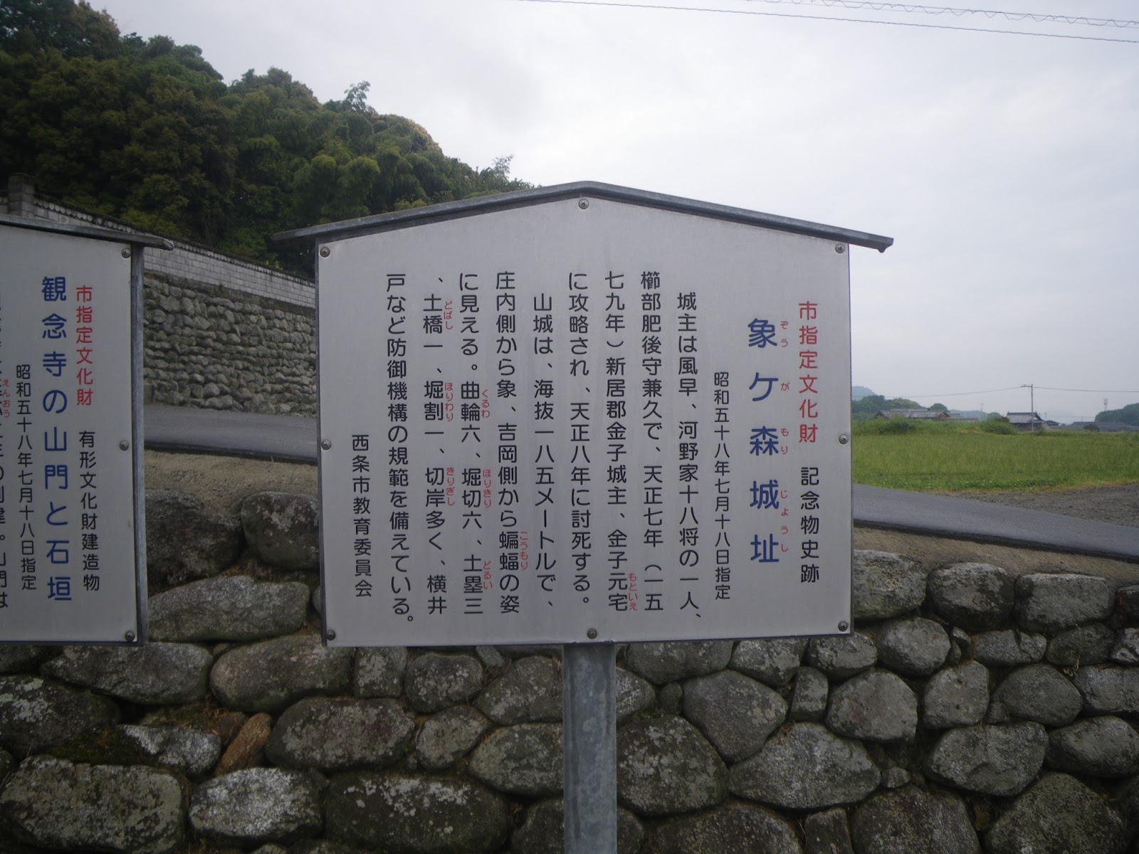 『東予市内(一部丹原町)河野氏ゆかりの史跡』に河野通盛ゆかりの社・寺・城、とあったため観念寺は通盛開基の寺かとも思ったのだが、どうも観念寺文書に通盛に関する記載がある、といったことのようだ。「えひめの記憶」でチェックすると、貞治元年(1362)の観念寺文書に「河野通盛、観念寺に禁制を掲げる」といった記載が見つかった。
