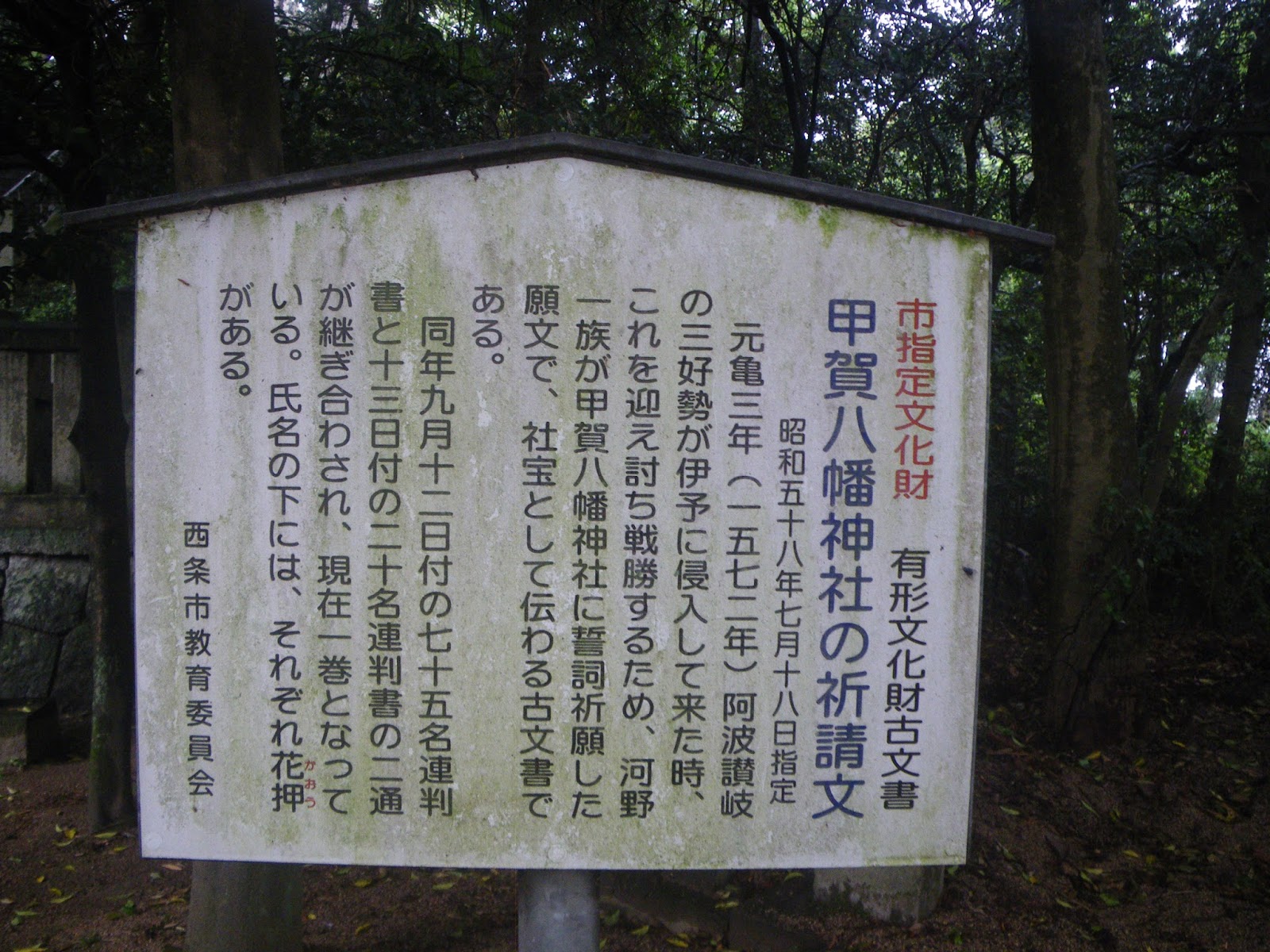 鷺の森城は、「伊予西条 河野氏ゆかりの地散歩 そのⅣ」の第27代・河野通盛の項でメモ、甲賀八幡の祈請文は「伊予西条 河野氏ゆかりの地散歩 そのⅥ」の第29代河野通暁の項でメモしたので、ここでは省略。