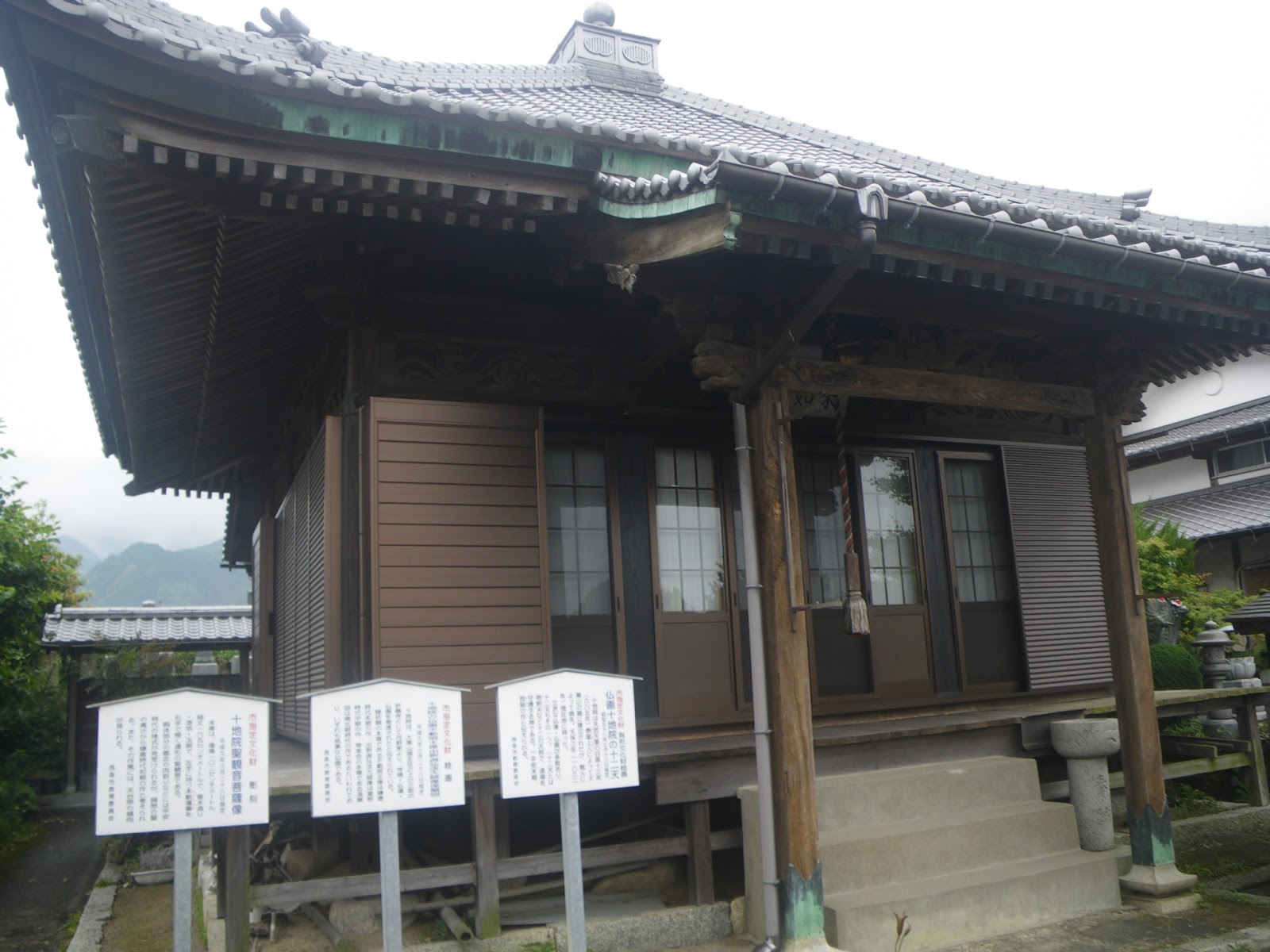 予讃線伊予三芳駅の南東、大明神川の左岸にある真言宗御室派のお寺さま。両側から伸びたソテツ(?)を潜り本堂にお参り。通宣との繋がりを示す案内は特に見当たらなかった。