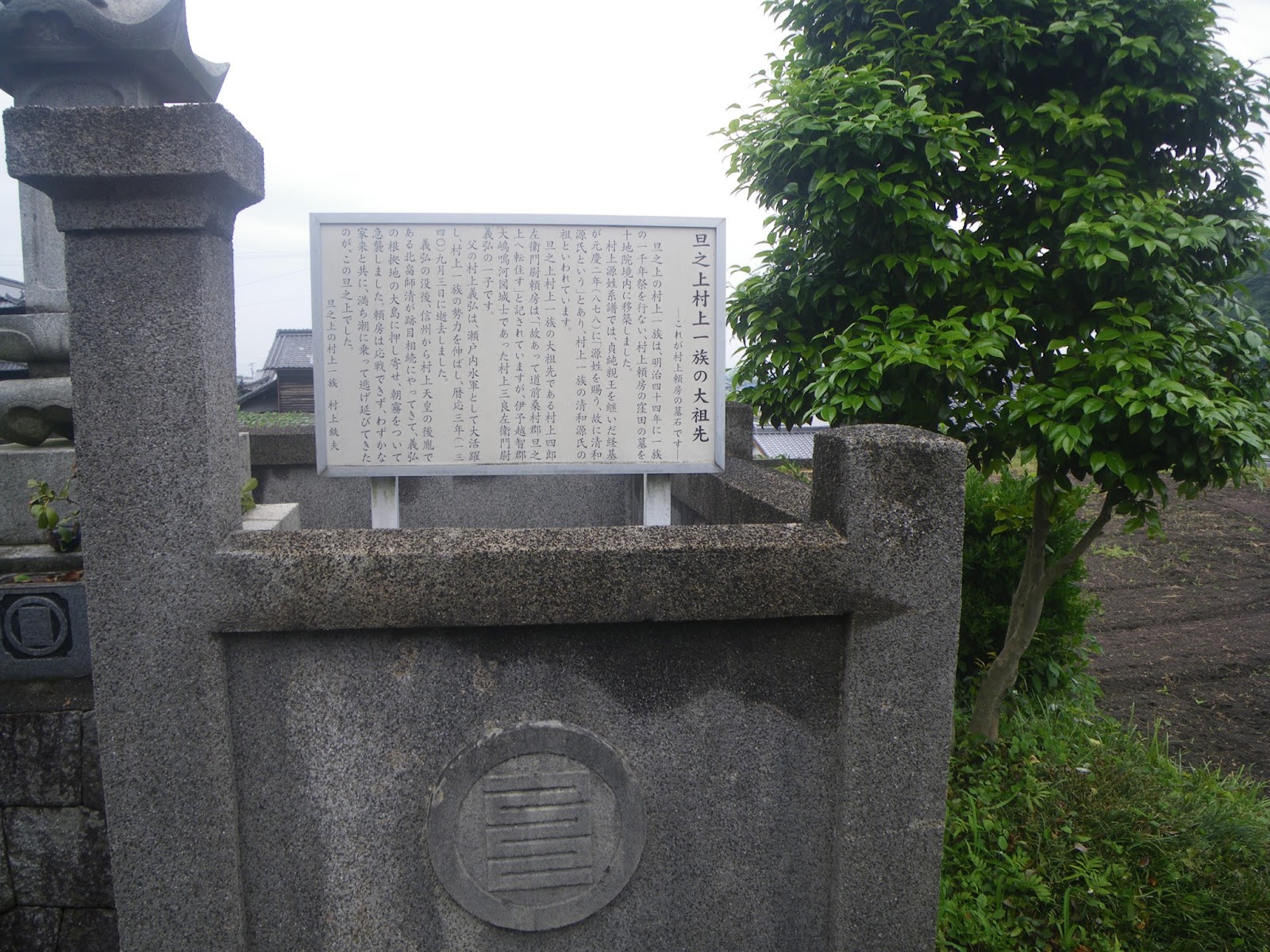 境内に「旦之上村上一族の大祖先」の案内があった。概略をメモすると、「村上頼房の墓石。旦之上の村上一族は明治44年、窪田の村上頼房の墓を十地院境内に移築した。(清和源氏の流れである)旦之上村上一族の大祖先村上頼房は「故あって道前桑村郡旦之上に転住す」とあるが、伊予越智郡大島鳴河図城士であった村上義清の一子である。