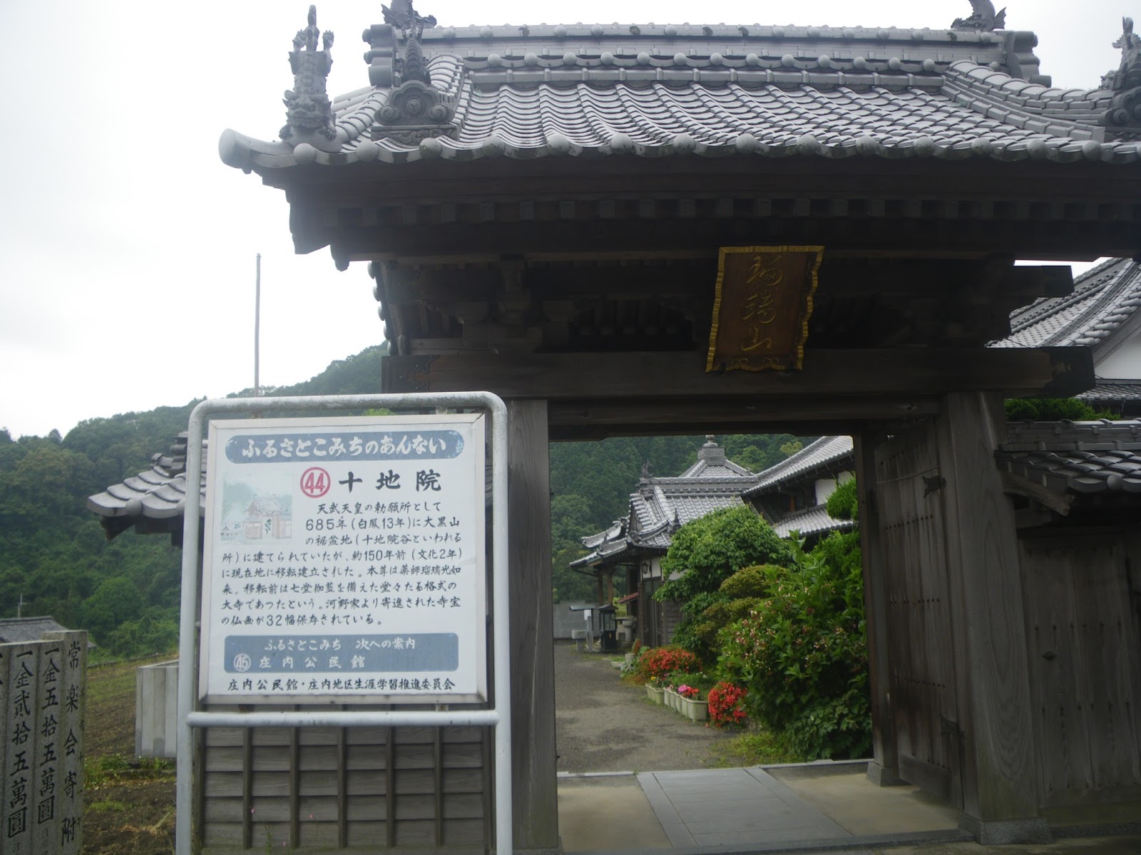 山門脇にある案内には「天武天皇の勅願所として白鳳13年(685)に大黒山の裾盆地(十地院谷といわれる所)に建てられていたが、約150年前の文化2年に現在地に移転建立された。本尊は薬師瑠璃光如来。移転前は七堂伽藍を備えた堂々たる格式の大寺であったという。河野家より寄進された寺宝の仏画が32幅保存されている」とあった。