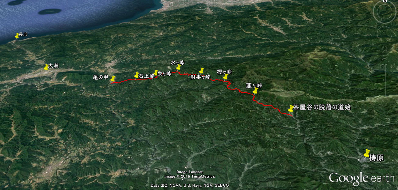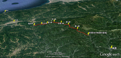 龍馬脱藩の道;予土国境山越えルート(Google Earthで作成) |