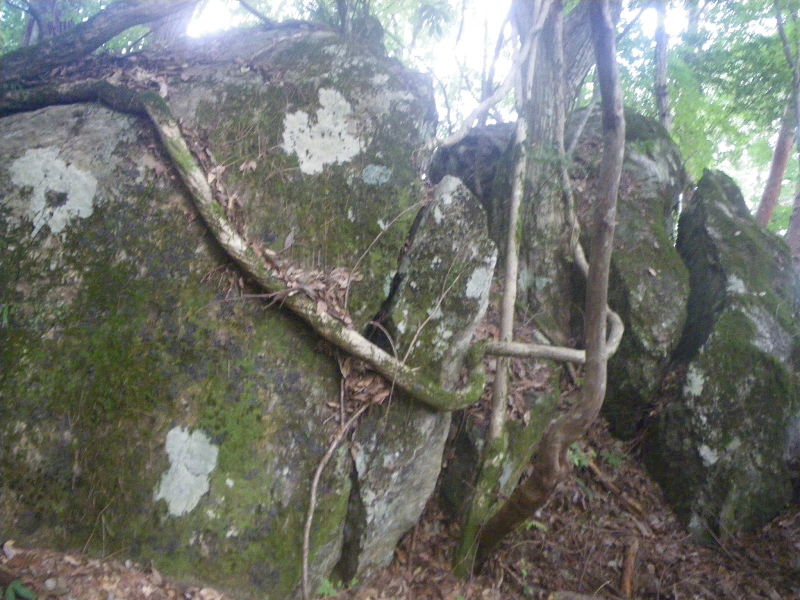 城の森(山の神城)から先の尾根筋を下る道も、等高線の間隔が比較的広くそれほど厳しくない。その尾根筋を5分ほど下ると大岩があり「笄岩」の案内。「?(こうがい)岩 嘉永二年(一八四九年)四月、大洲十一代藩主、加藤泰幹、小田筋迎郷の際、同月三日神納天神社に宿陣、翌四日小屋村視察に向はれる途次ここに駕籠を止め休息された。その時同行の姫君がこの岩に上ってあそばれているうち、岩の裂目に?(こうがい。昔、髪をかきあげるための理髪具で、のち髪飾としても使われた。)を落とされ、どうしても取ることが出来なかったのでそのままにして行かれた。