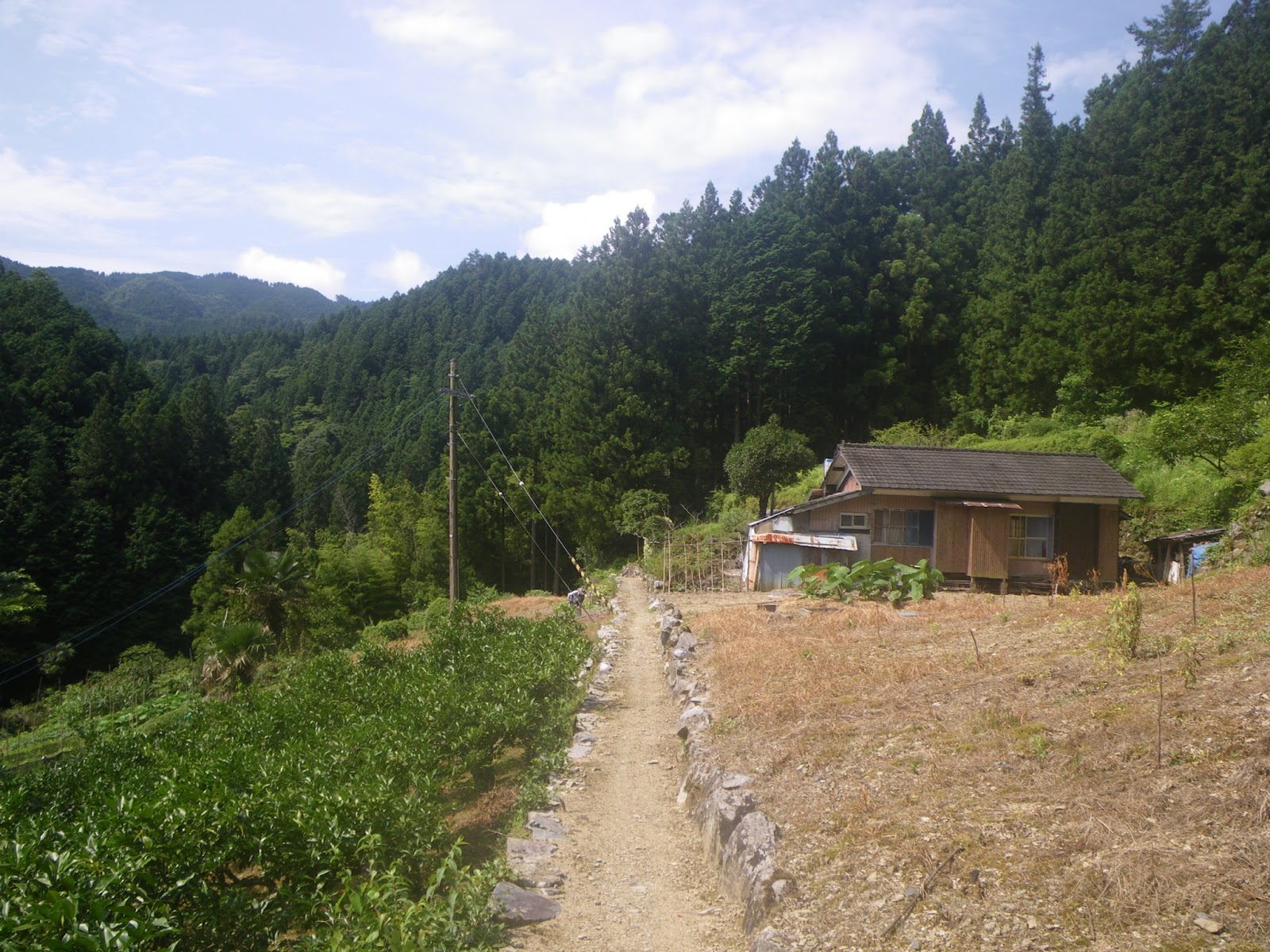 林道を少し進むと、「坂本龍馬脱藩の道」の木標があり、右に土径を下る。途中も脱藩の道の木標に従い左に折れると、先ほど離れた林道に出る。周りには民家が建つ。国木の集落だろう。