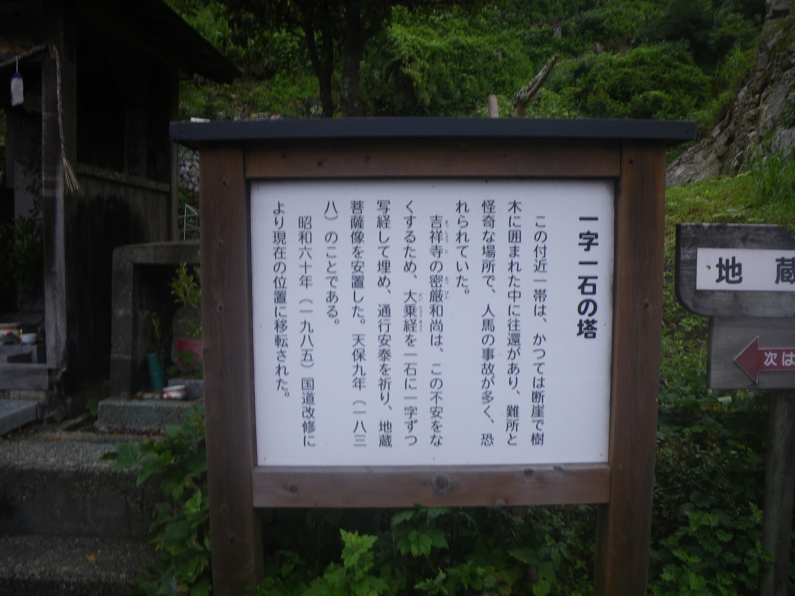 町を離れ2車線の国道を走ると、道の左手に祠がある。車を停めると「一字一石の塔」の案内。「この付近一帯は、かつては断崖で樹木に囲まれた中に往還があり、難所と怪奇な場所で、人馬の事故が多く、恐れられていた。