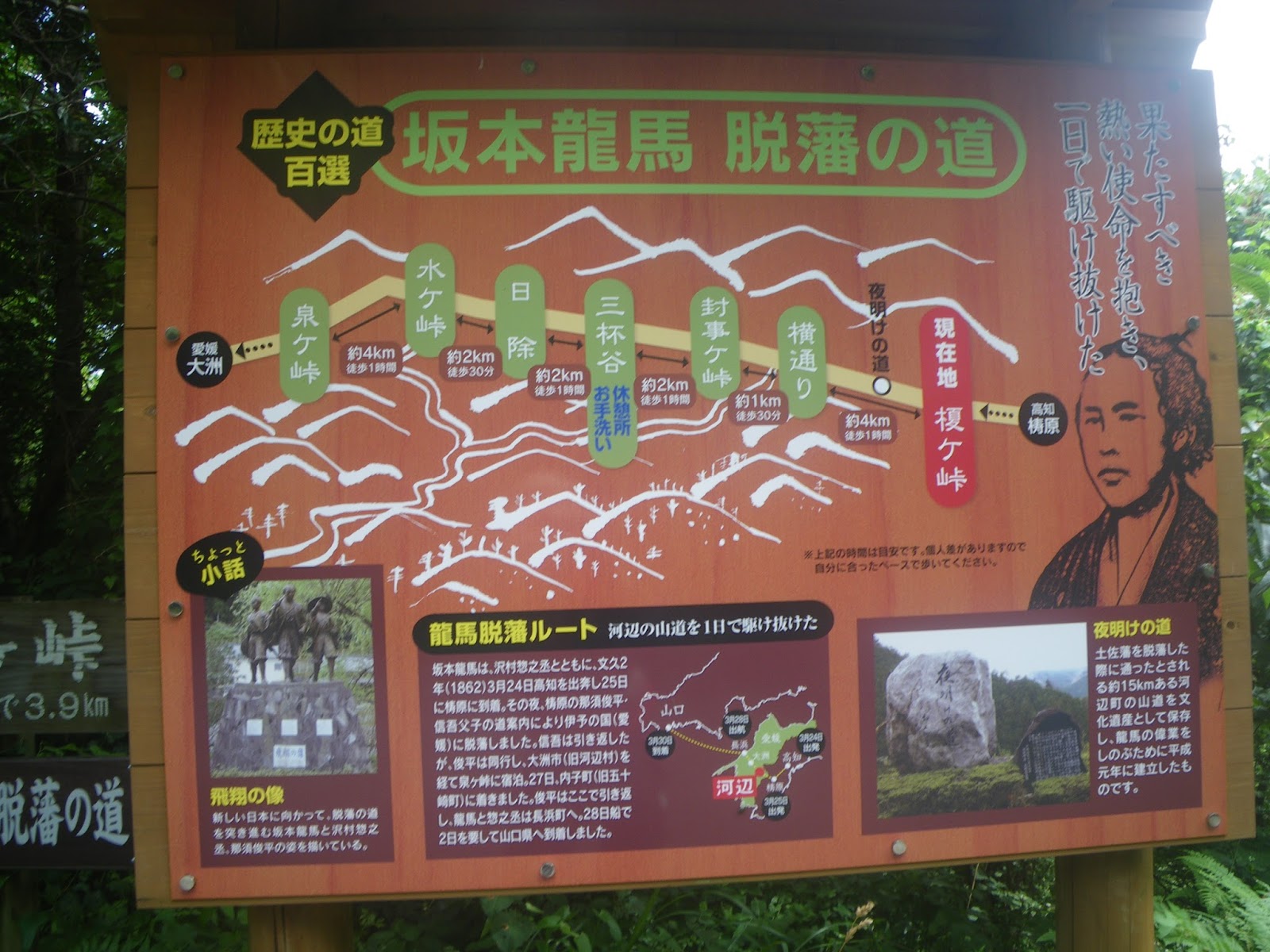 その案内にはそこに榎ヶ峠から先のポイントまでの距離と時間が、それと河辺町の脱藩の道の説明があった。