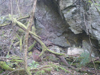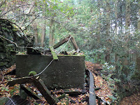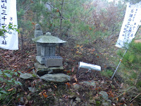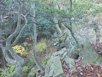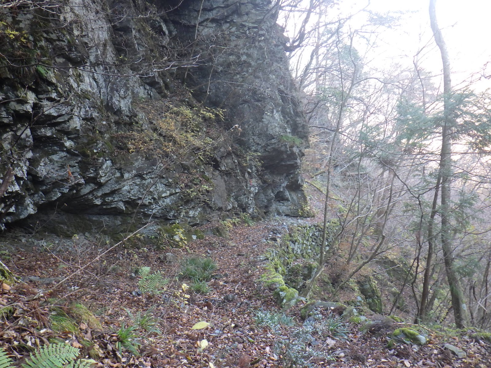 地図に示されるだけであり、実際に歩けるかどうか行ってみなければわからないのだが、ともあれショートカットできれば、そのルートを進み、十二社バス停傍の脇道に入り朝比奈の切通しへ。周囲を山で囲まれた鎌倉への往還のために山稜を切り開き通した七口(7つの切通し)のひとつである。 朝比奈の切通しからの戻りは、切り通し近くの熊野神社から十二社方面に尾根筋を下る道らしきものが地図に見える。そのルートは等高線を垂直に下りている。転び滑りながら下りることになりそうではあった。