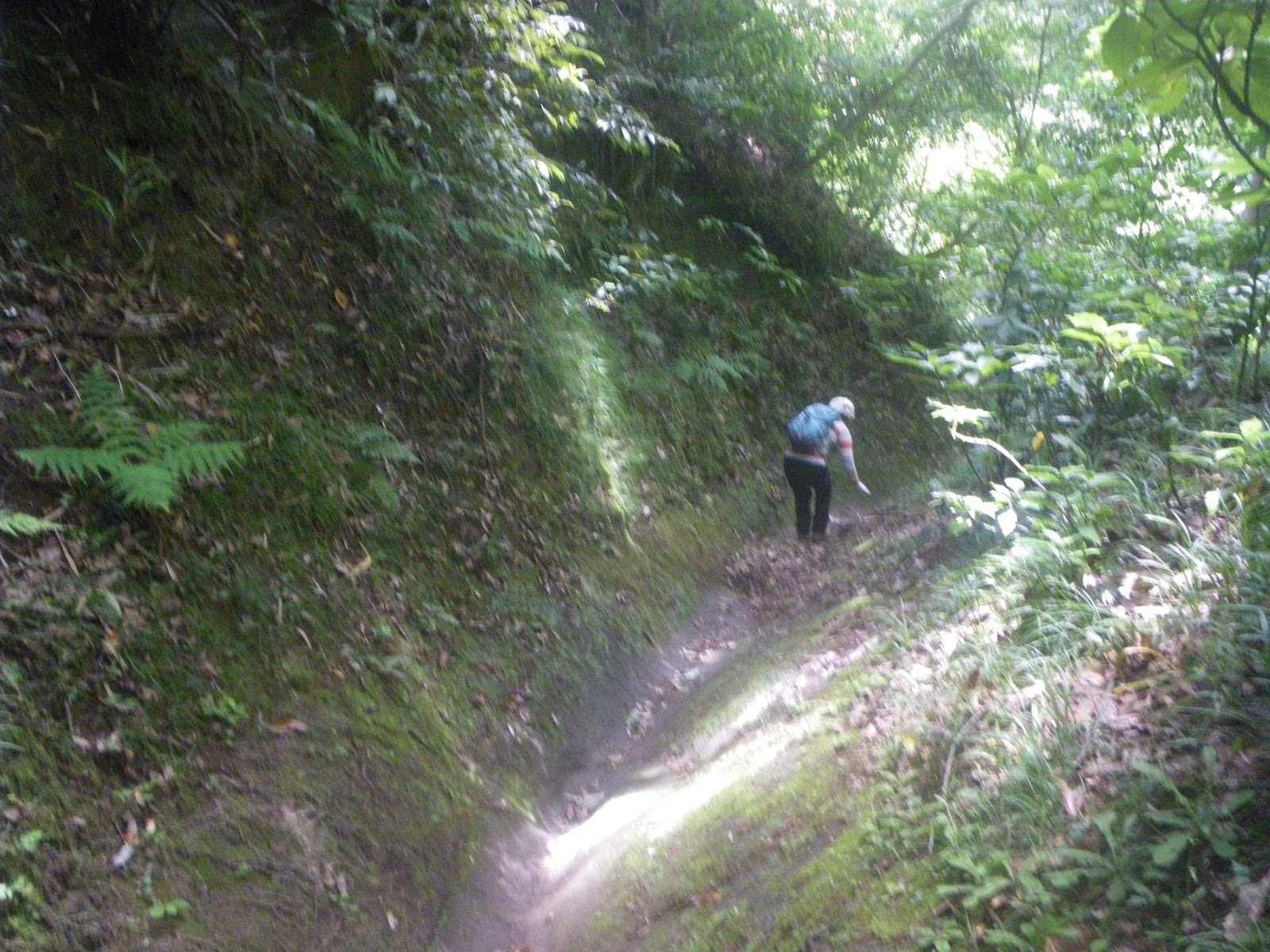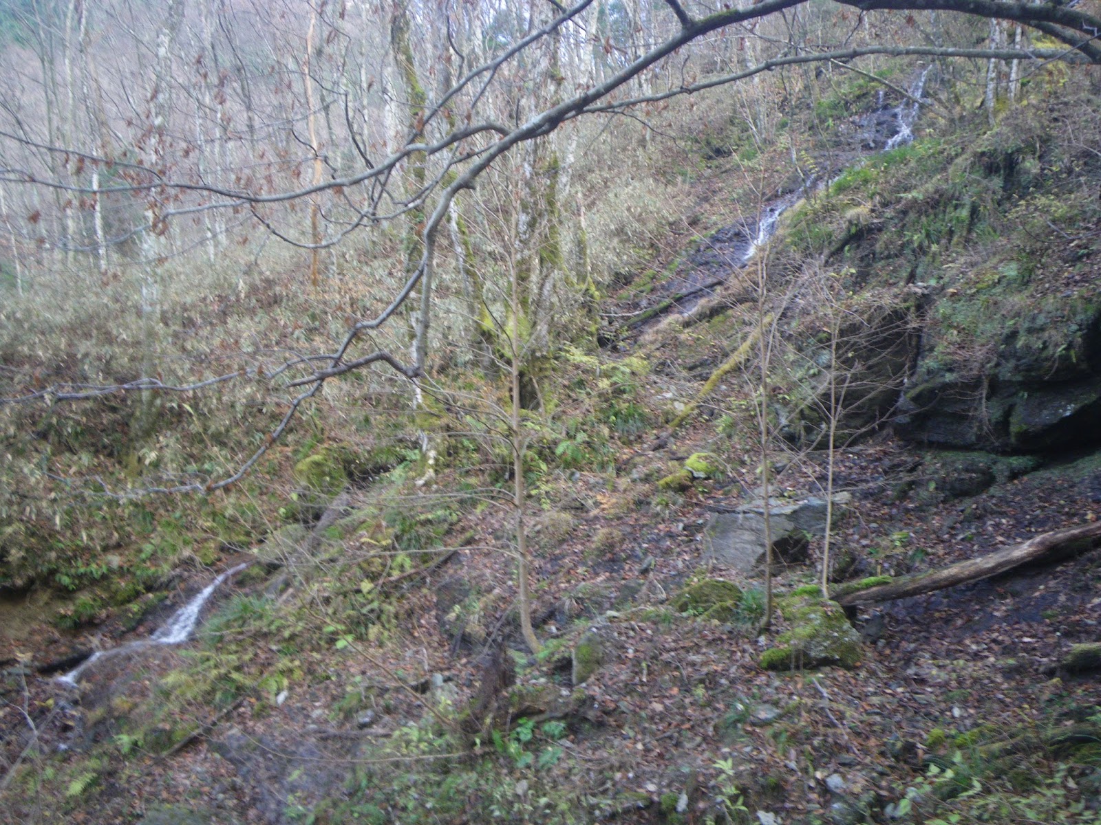 下り道は急な傾斜の上に粘土質の堀込みとなっており、足元が危うい。結構滑る。倒(こ)けつ転(まろ)びつ、三郎の滝に。