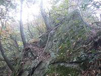 左手に植林、右手崖に自然林の間の岩場の多い尾根筋を20分ほど歩き、高度を120mほど上げると王子社の幟が見える。途中鎖場もあった。